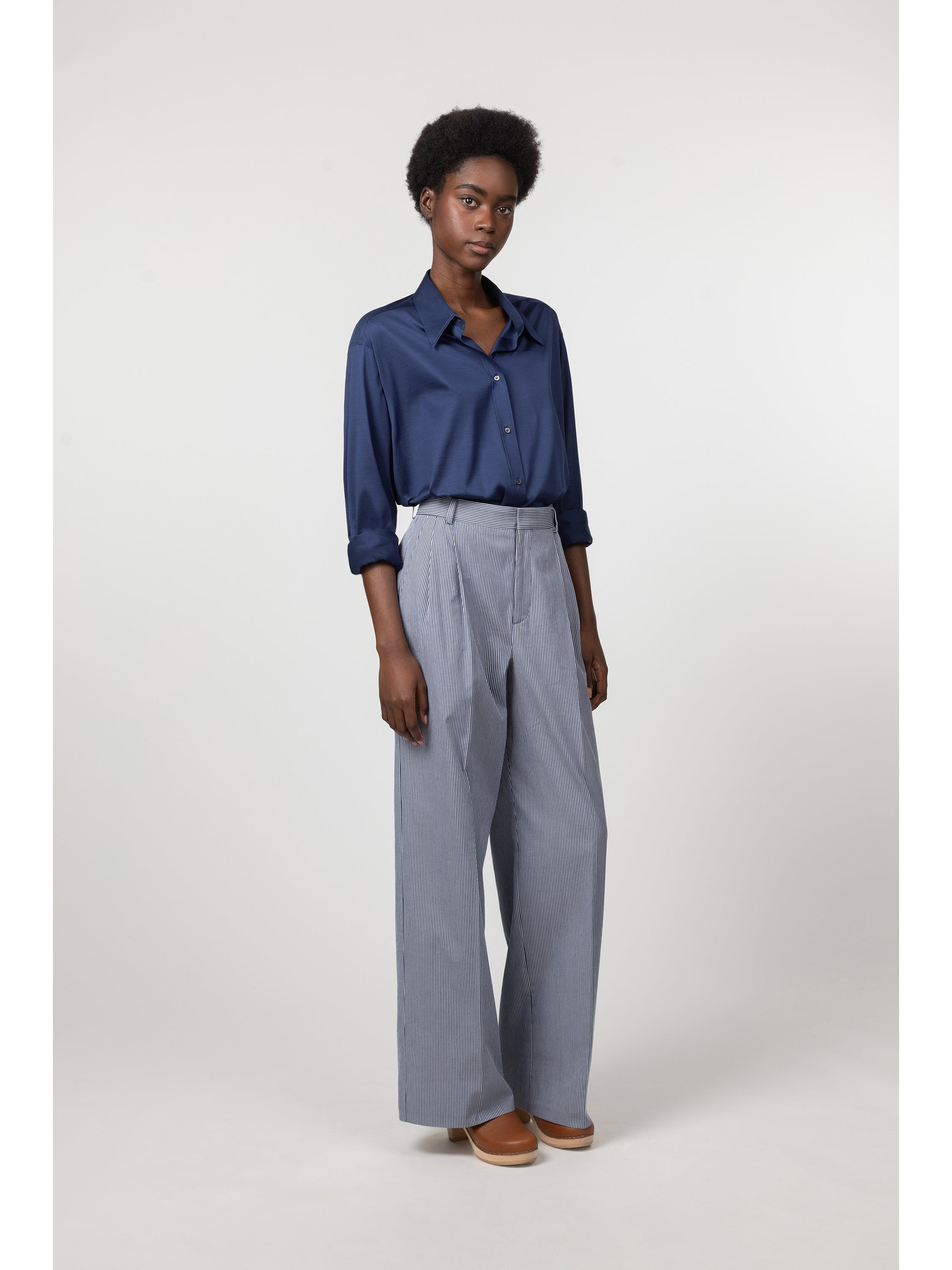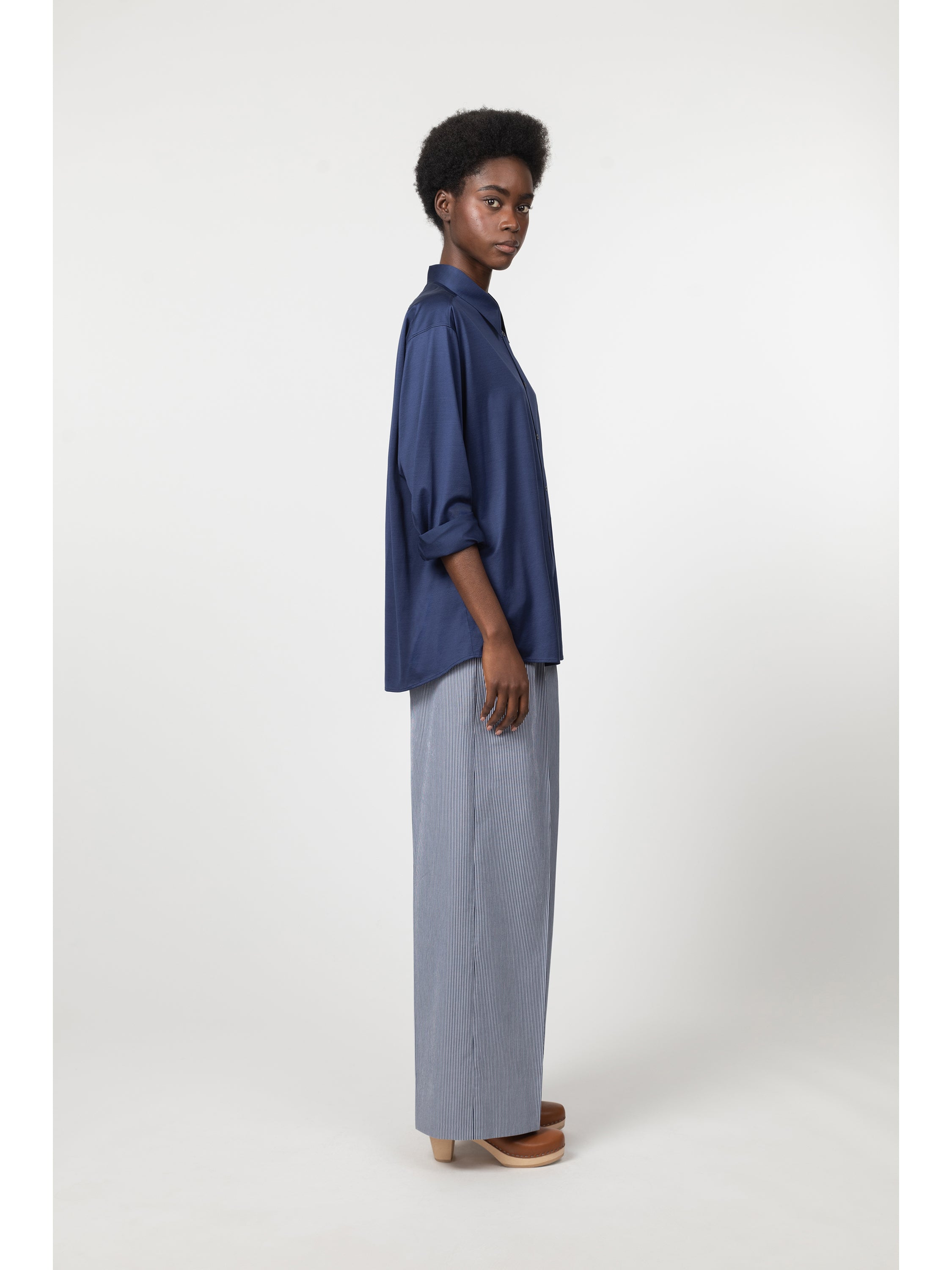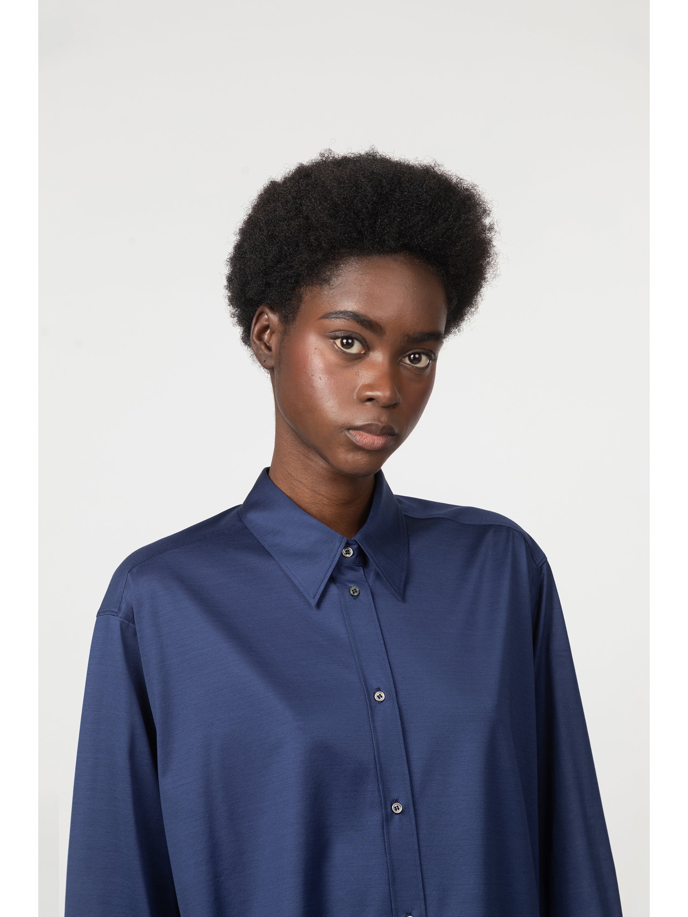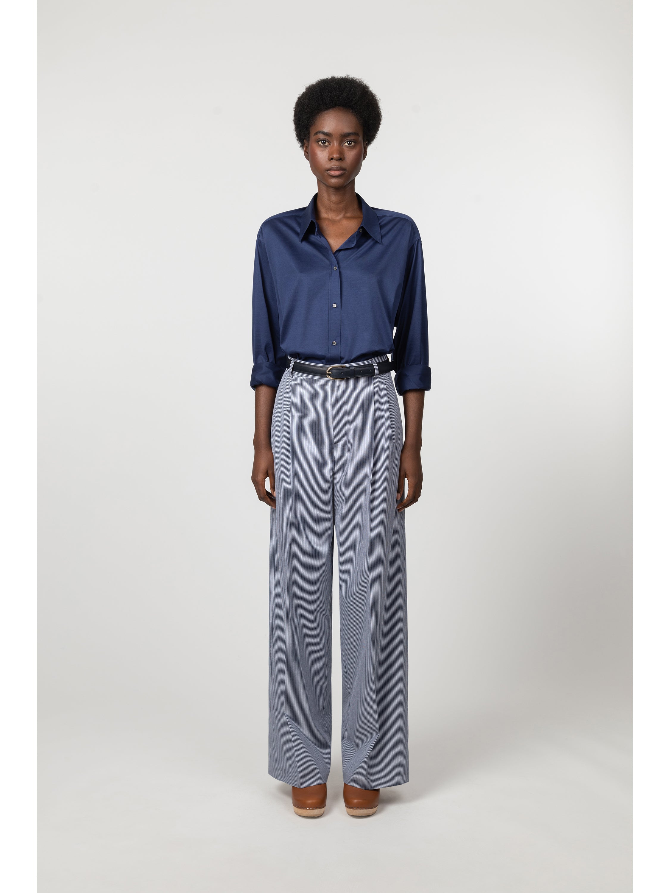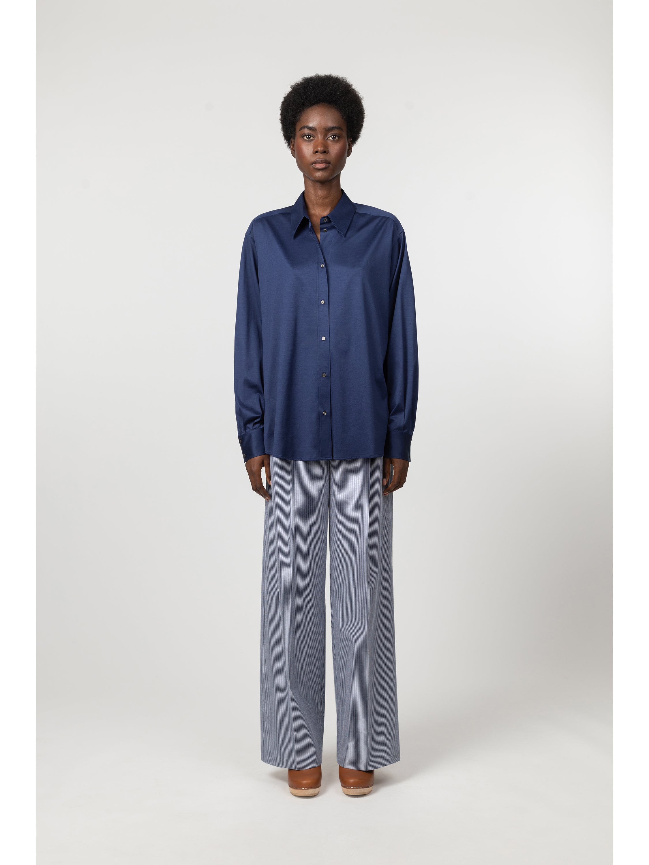 This shirt is made from a high-grade Italian interlock mercerized cotton jersey with a slight satin effect. The fabric is knit by Besani, a mill founded in 1969 near Milan. The thin rib offers a soft and supple hand that adds a feminine touch to this masculine silhouette. Details include a spread collar, rounded cuffs and a pleat beneath the back yoke. The front closure is made with tone-on-tone mother of pearl buttons.