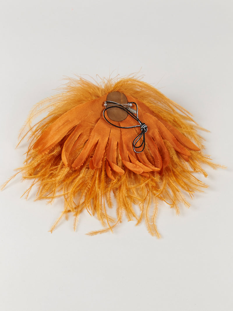 Designed in the north of Paris by one of the last feather masters in France, this brooch is made from lush ostrich feathers dyed in exclusive colors developed by the INDRESS studio and drawn from our collection. It is adorned with three hand-embossed upcycled silk petals and finished with lambskin leather. Details include a silver clasp and an elastic band to place the brooch on a garment, in your hair or on a wrist.