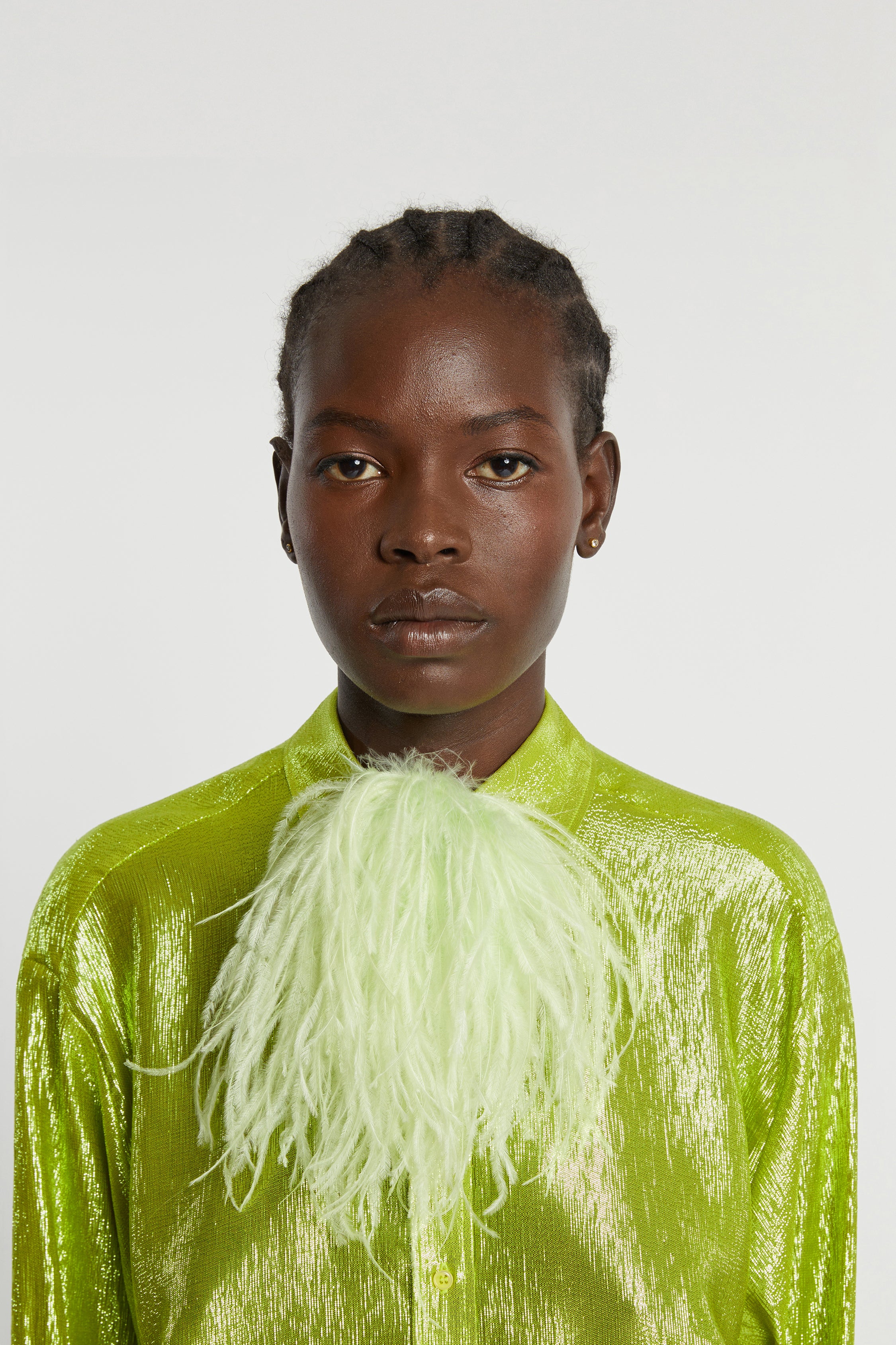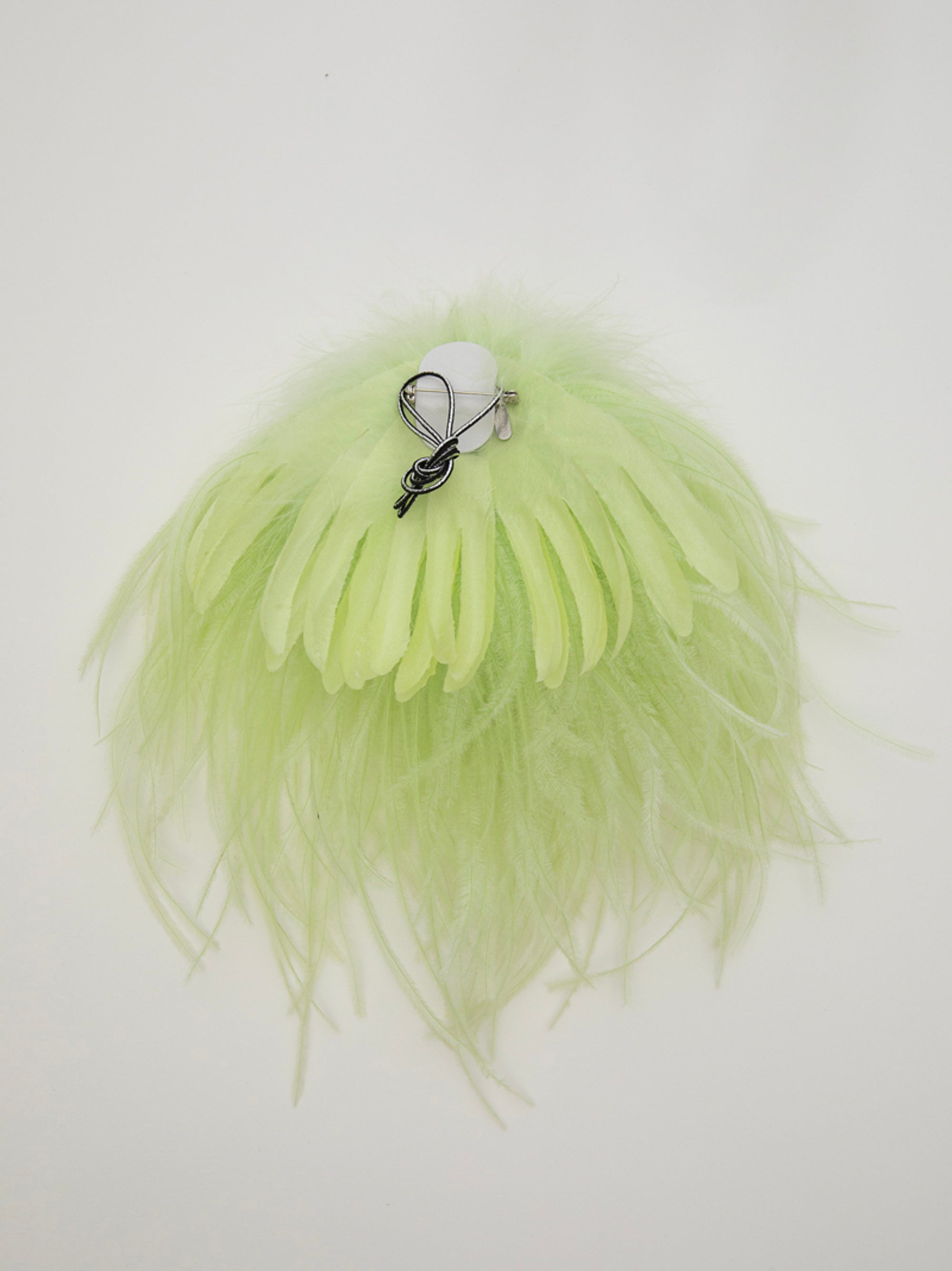 Designed in the north of Paris by one of the last feather masters in France, this brooch is made from lush ostrich feathers dyed in exclusive colors developed by the INDRESS studio and drawn from our collection. It is adorned with three hand-embossed upcycled silk petals and finished with lambskin leather. Details include a silver clasp and an elastic band to place the brooch on a garment, in your hair or on a wrist.