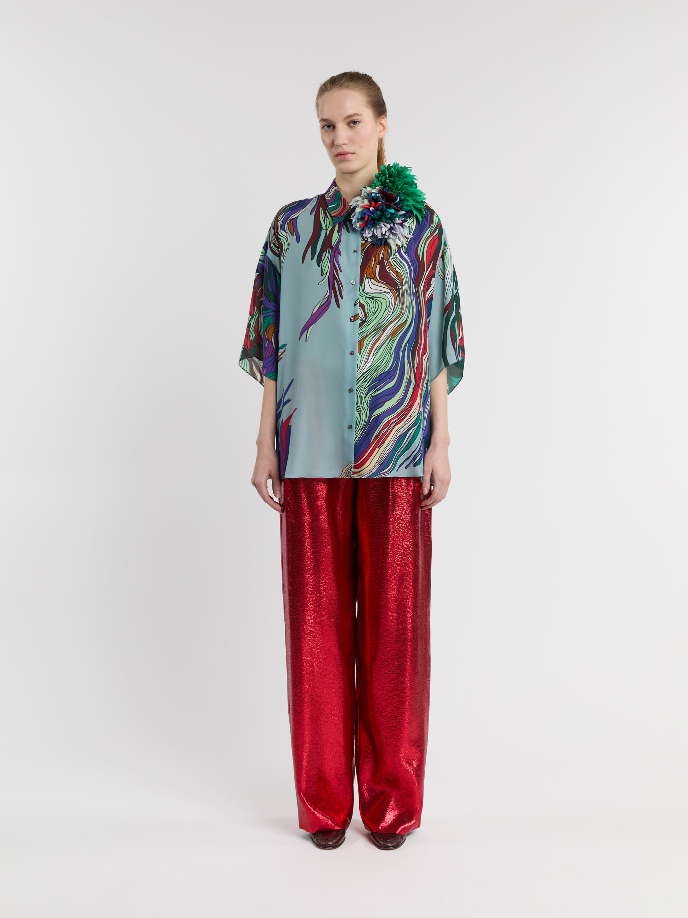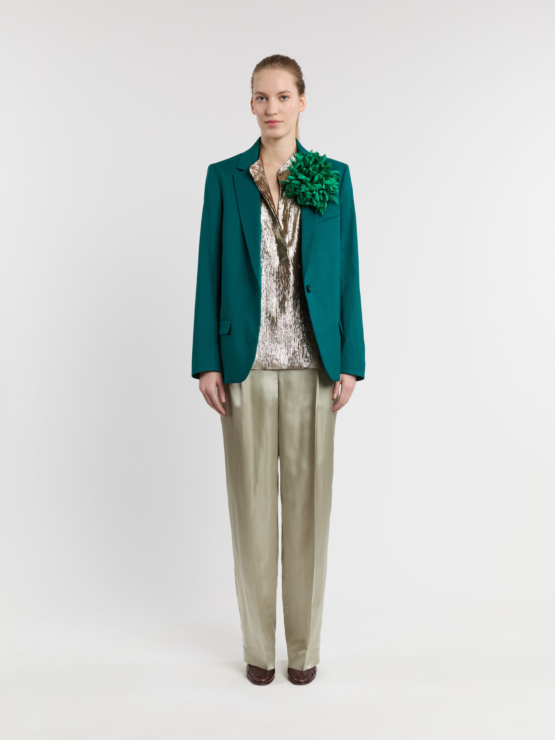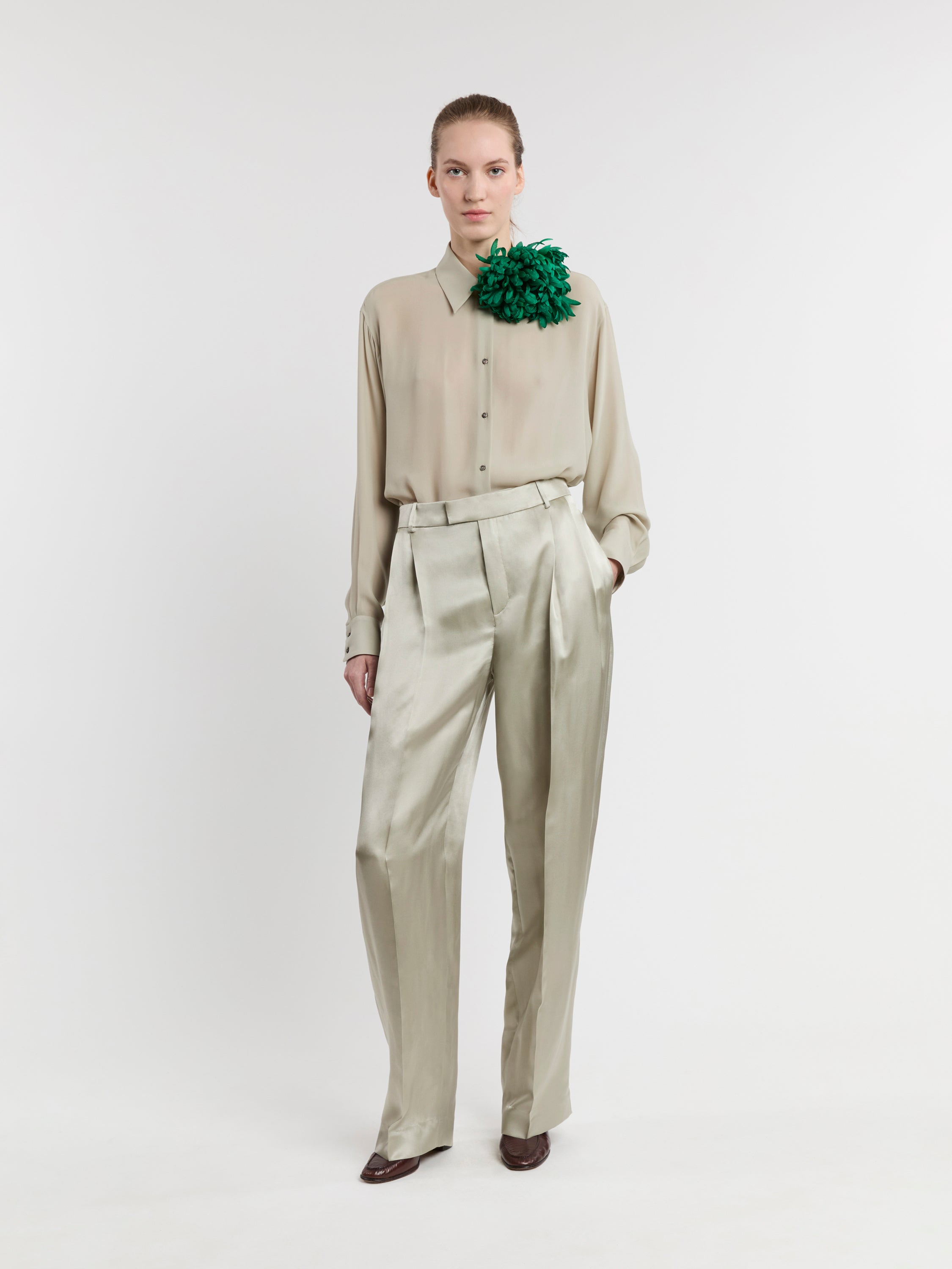 Our silk brooches are handmade in Paris by one of the last independent flower ateliers. They are created with scraps of silk remaining from our collections. The silk is stiffened, cut with a punch and embossed to obtain the shape of a petal. Once assembled, the flower is finished on the back with lambskin leather, a metal pin closure and an elastic band. The flower can be worn on a garment, as a headband or bracelet around the wrist. The colors of each flower are developed in our atelier and the brooches are produced in limited editions. This flower is made of tone-on-tone petals that will naturally soften over time.