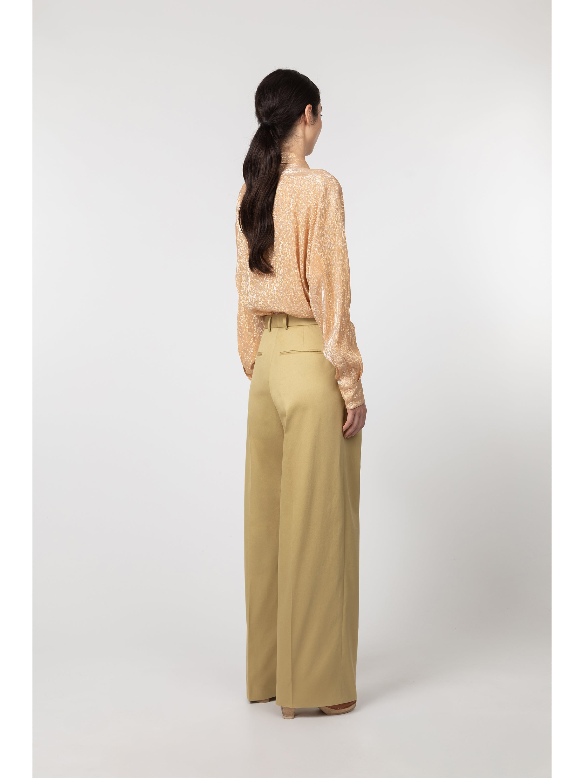 This shirt is made from a silk and lurex crepe woven in France by Les Tissages Perrin, a mill founded in 1929 near Lyon. The silk yarn is overdyed to create a subtle two-tone effect, giving it depth and radiance. The silhouette is oversized and relaxed. Details include a spread collar, a mother-of-pearl button placket and a single pleat beneath the back yoke for ease and comfort.