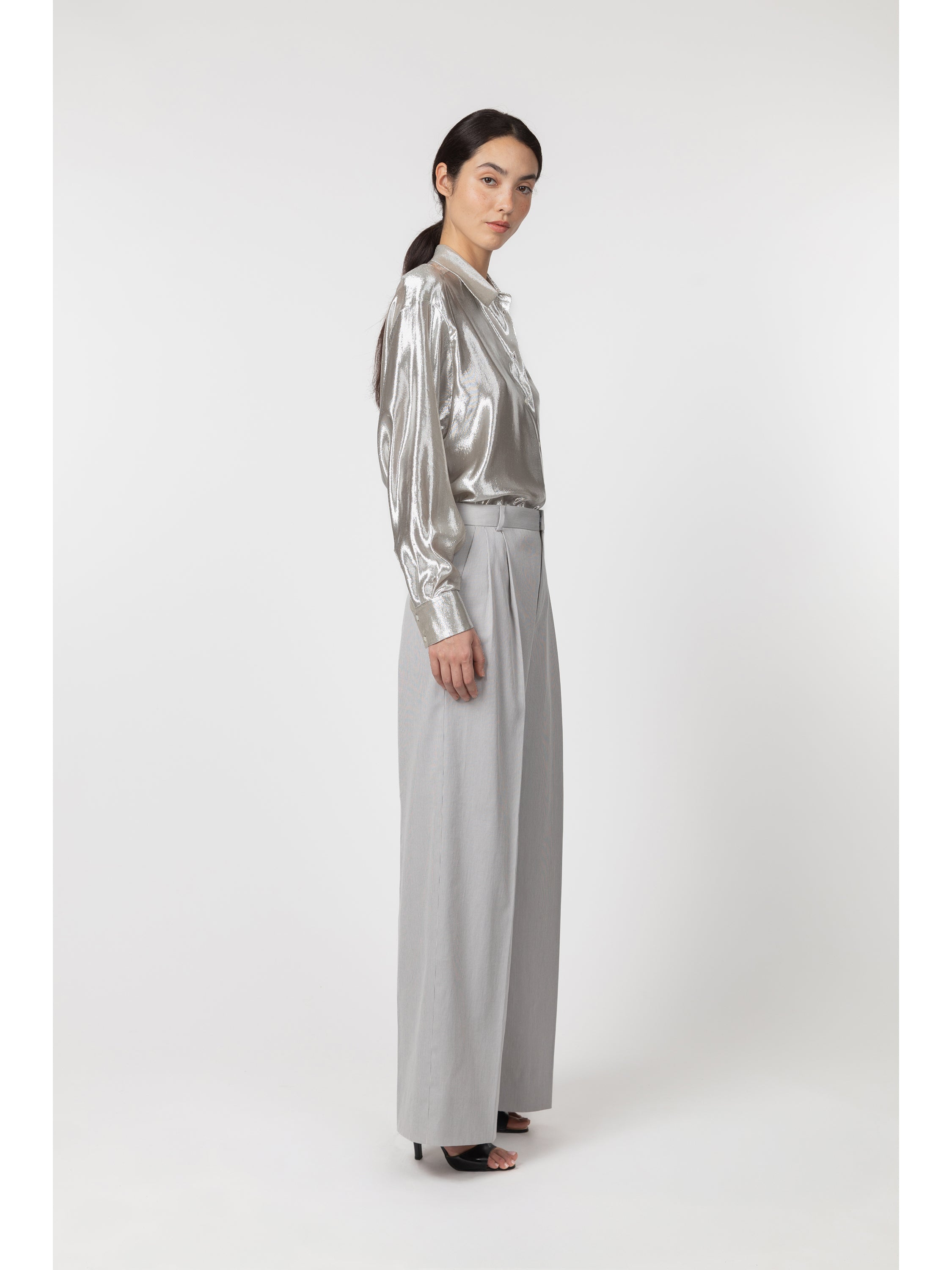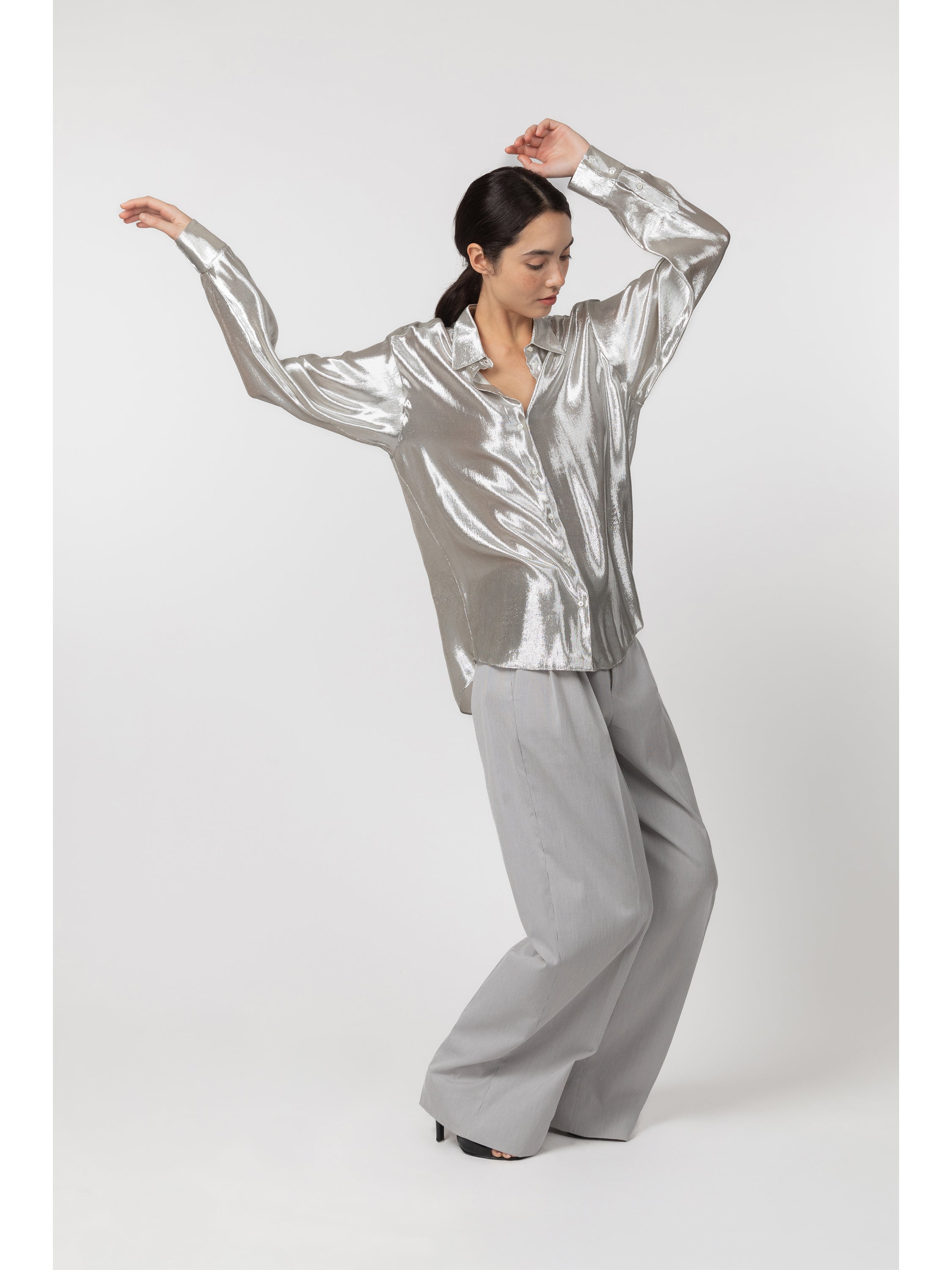 This shirt is made from a fluid and radiant silk and lurex fabric woven in France by Denis & fils, a mill founded in 1956 near Lyon. The silk yarn is overdyed to create a subtle two-tone effect. The silhouette is oversized and relaxed. Details include a spread collar, a mother-of-pearl button placket and a single pleat beneath the back yoke for ease and comfort.