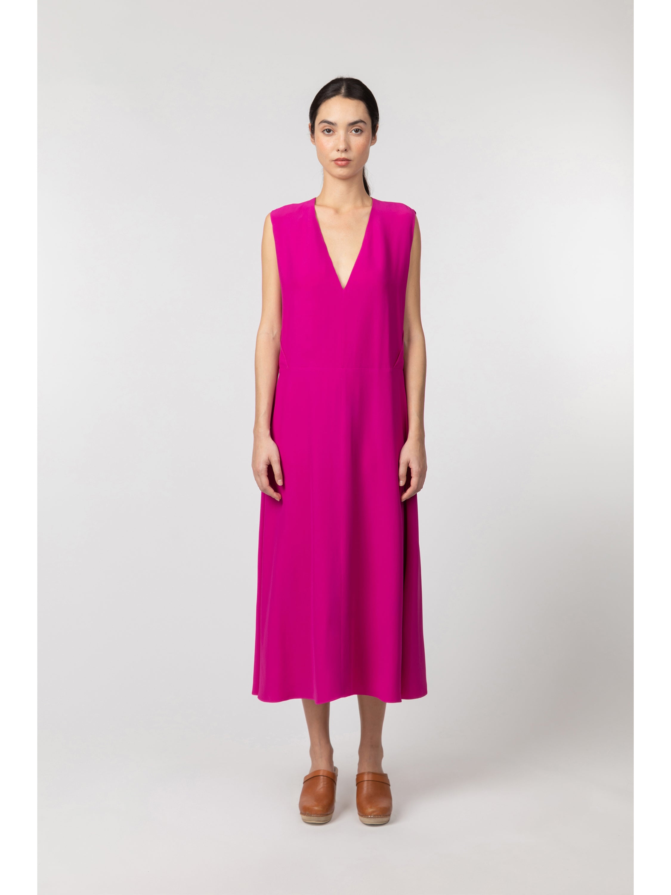 This staple dress from the collection is made from an Italian viscose and acetate fabric. This contemporary and pure silhouette is enhanced by a deep V-neckline and a split and open back. The fabric overlap around the armholes and back adds a carefully-studied curve to the upper part of the dress. The skirt is slightly flared. The dress is fully lined and closes at the back with a single mirror button and keyhole closure.