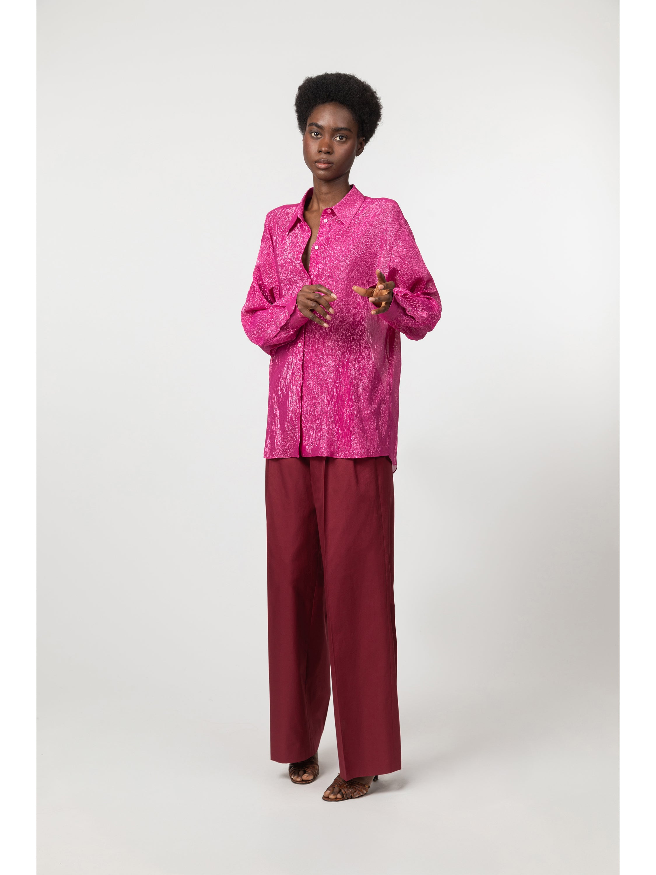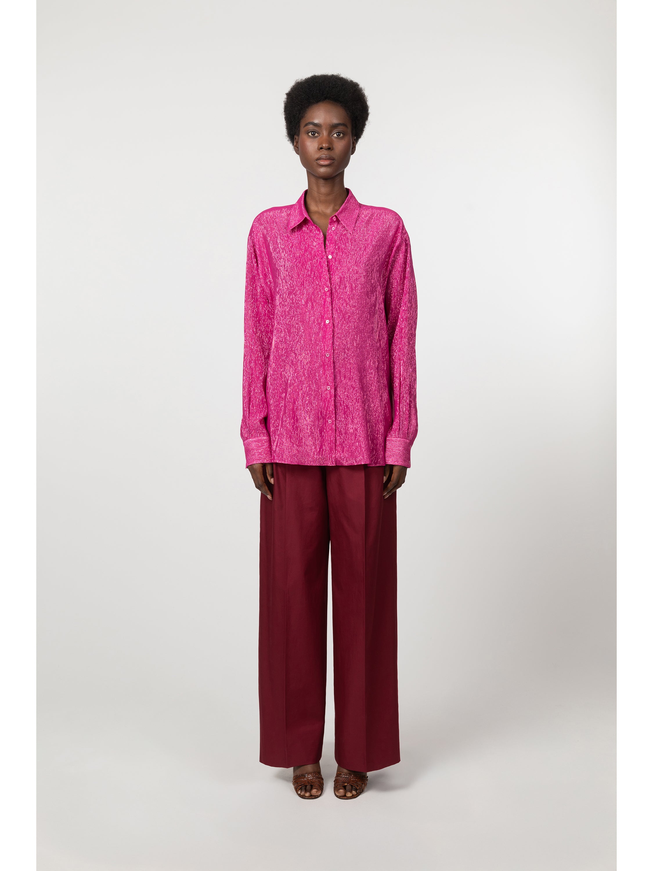 Cette chemise est réalisée dans un crépon de soie biologique et lurex tissé par Les Tissages Perrin, un soyeux français établi en 1929 près de Lyon. Les fils de soie sont surteints ce qui donne un reflet légèrement bicolore à cette matière vaporeuse. La chemise présente une coupe oversized et décontractée, ainsi qu’un pli de milieu de dos pour plus d’aisance. Elle se ferme à l’aide d’une patte de boutonnage avec des boutons en nacre ton sur ton.