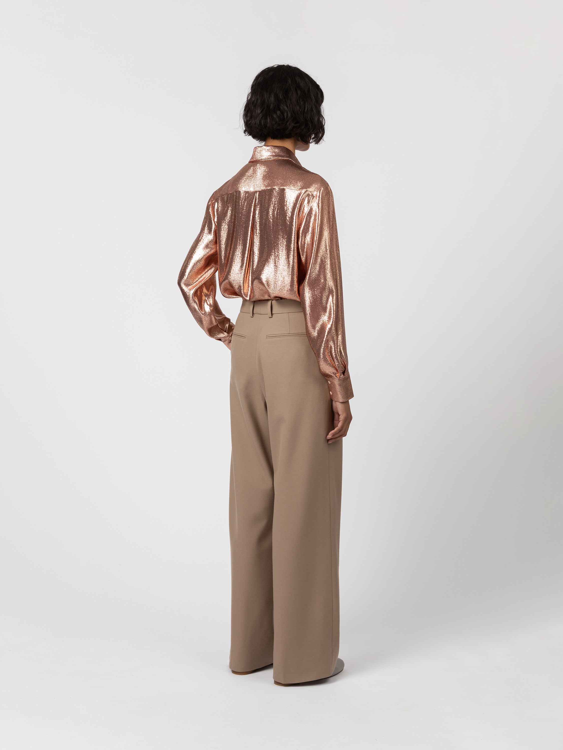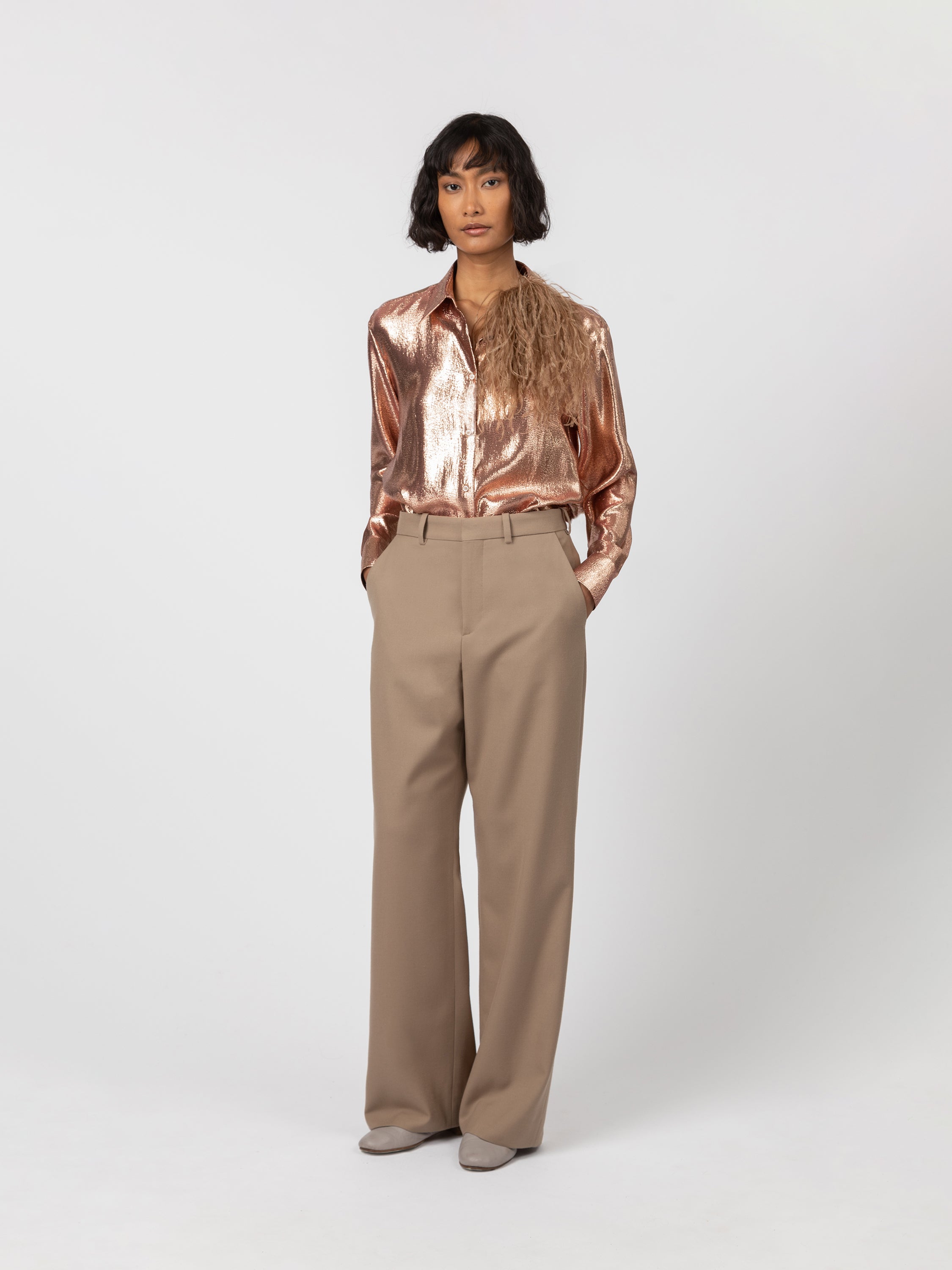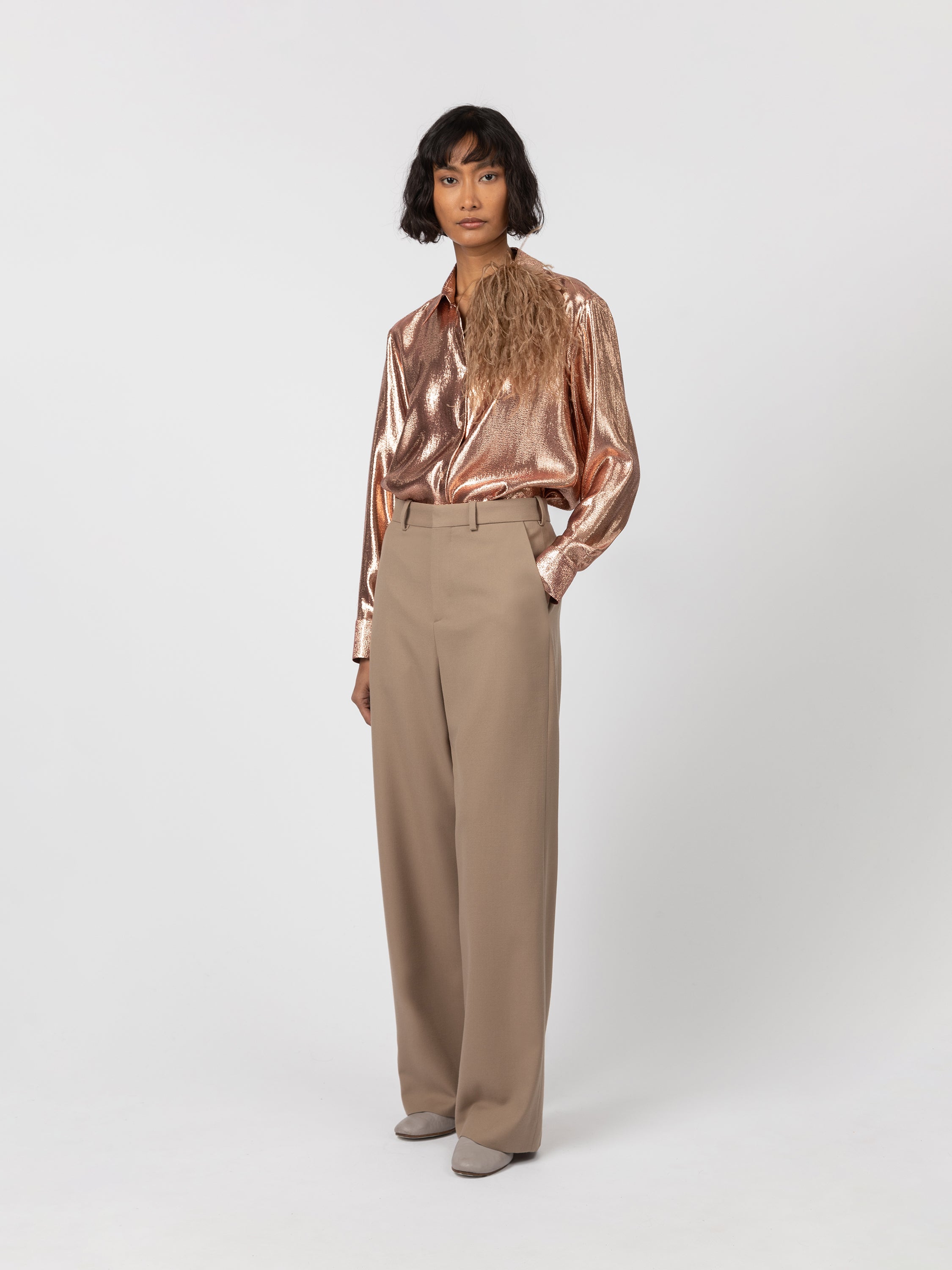 Pièce phare de la collection, ce pantalon est réalisé dans un sergé de laine tissé aux abords de Nagoya au Japon. Il se distingue par sa jambe droite et sa taille haute qui allongent la silhouette et en font une pièce pleine d’allure. Le pantalon se ferme à l’aide d’une fermeture éclair et d’une agrafe.