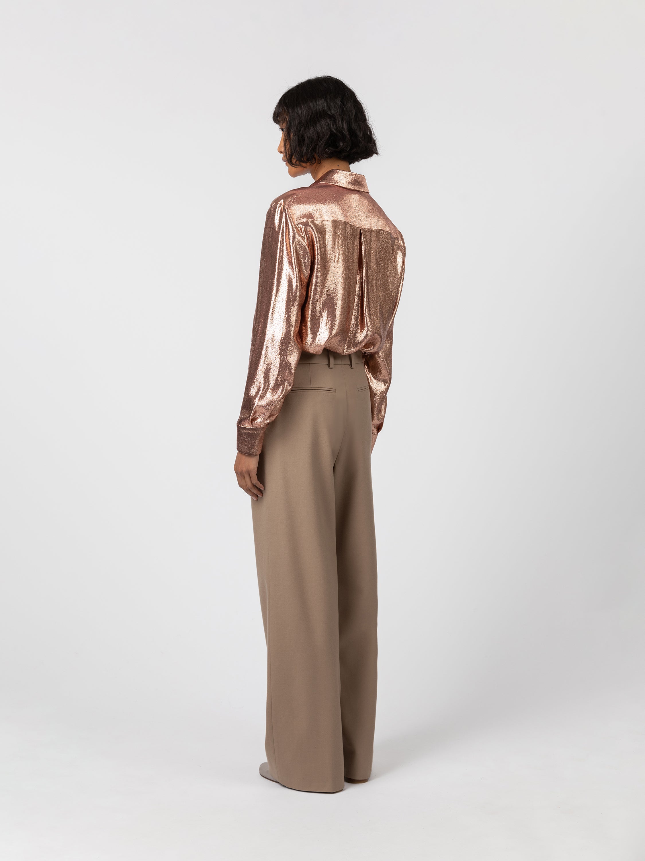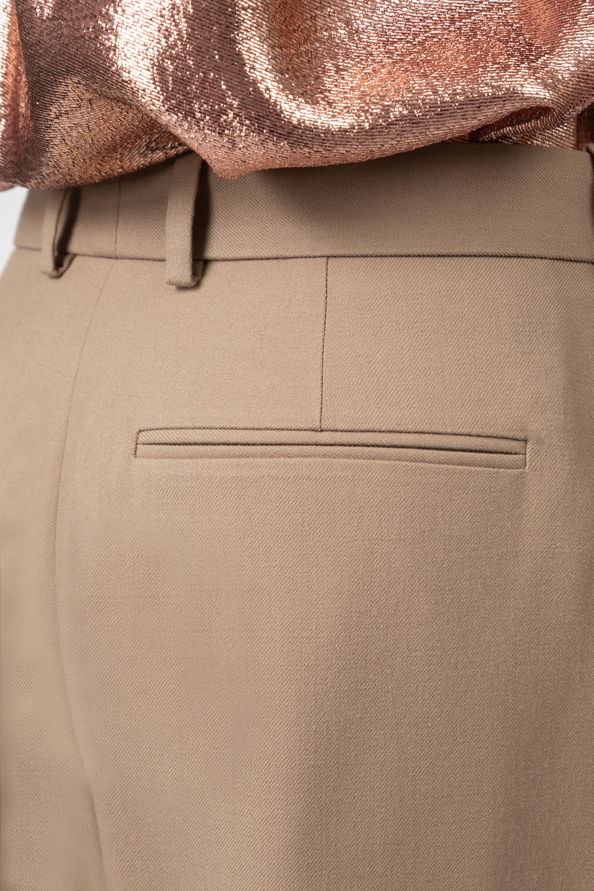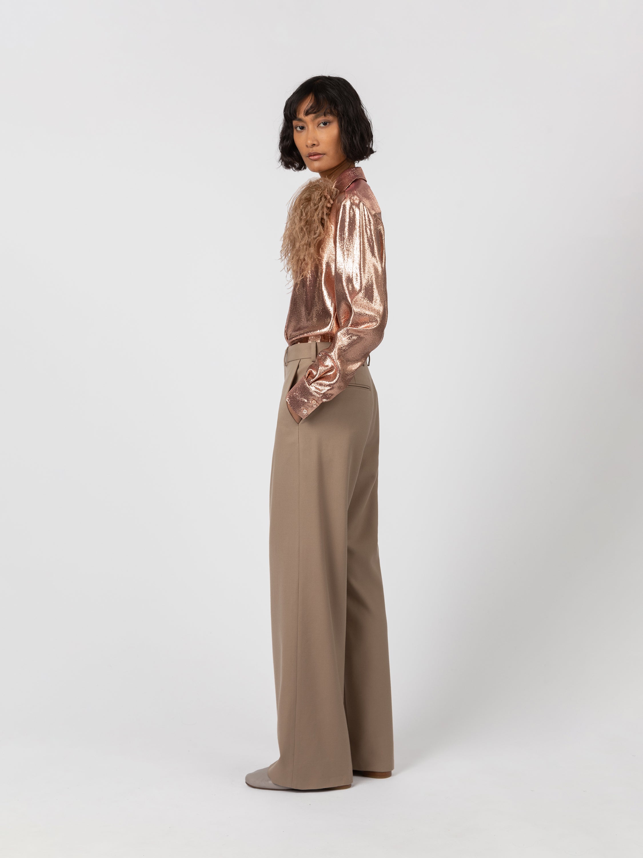 Pièce phare de la collection, ce pantalon est réalisé dans un sergé de laine tissé aux abords de Nagoya au Japon. Il se distingue par sa jambe droite et sa taille haute qui allongent la silhouette et en font une pièce pleine d’allure. Le pantalon se ferme à l’aide d’une fermeture éclair et d’une agrafe.