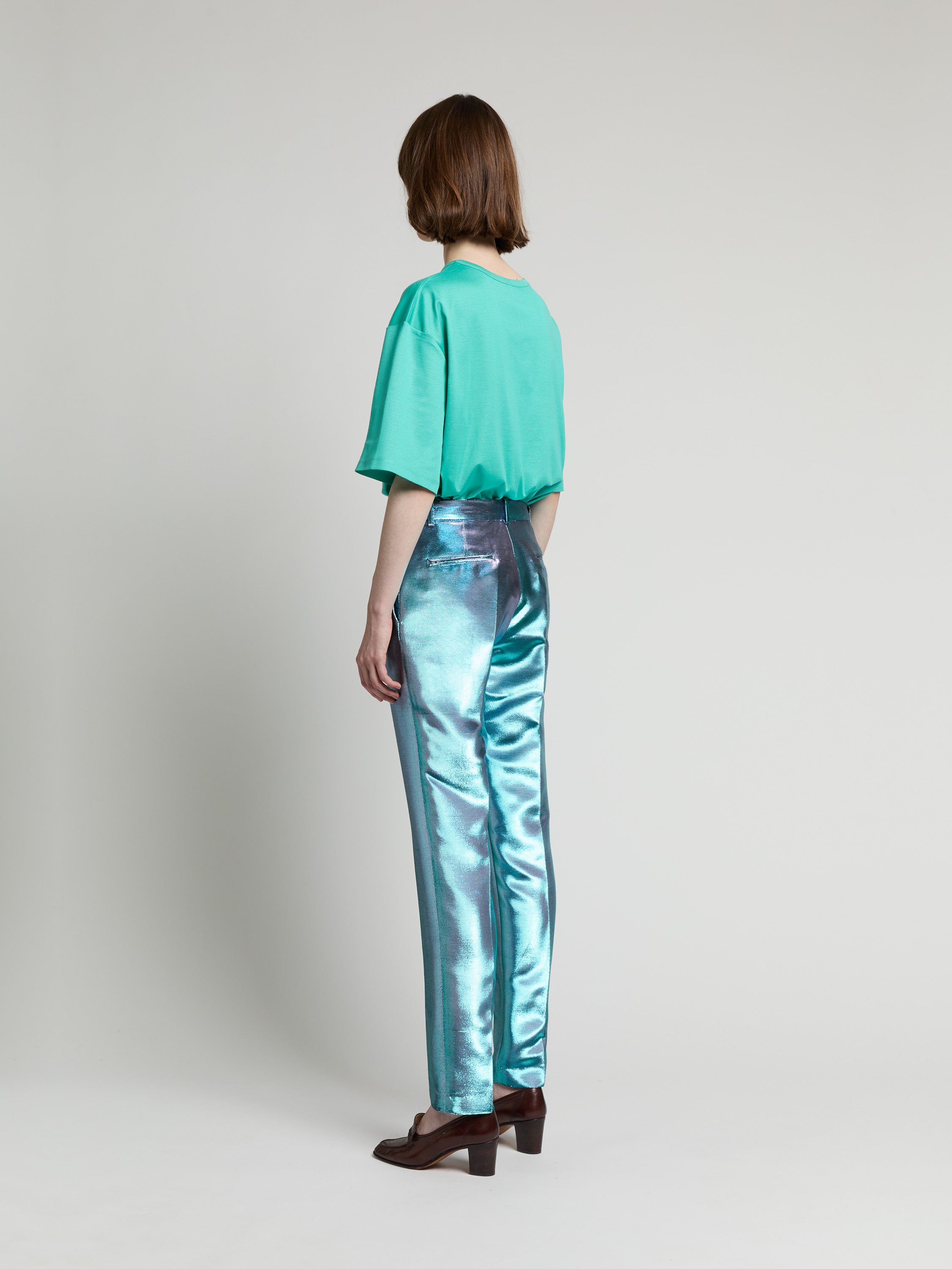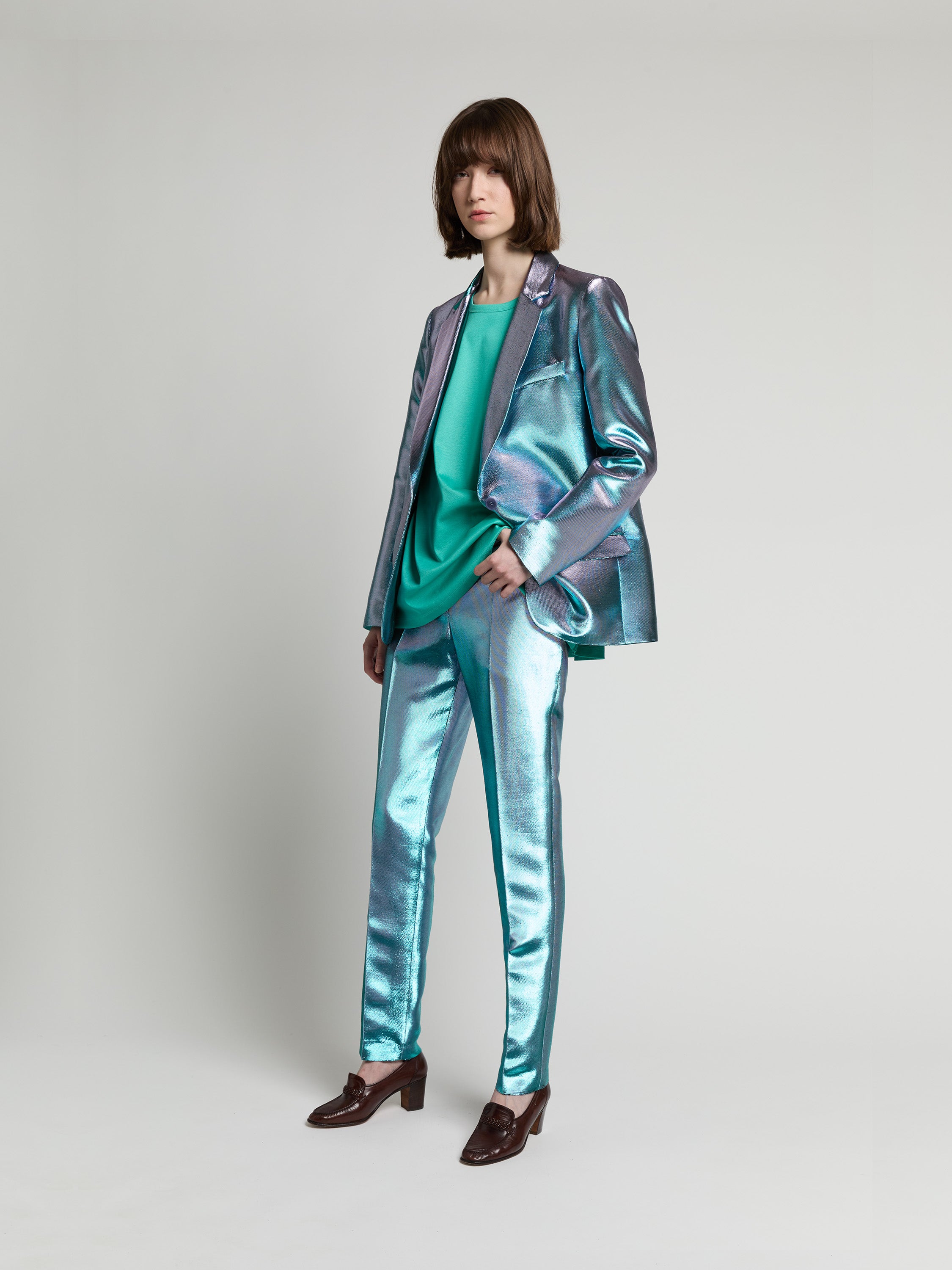 Pièce iconique du vestiaire INDRESS, ce pantalon est réalisé dans un twill de lurex tissé dans la région lyonnaise chez Denis & Fils. Structuré et souple, il présente une coupe ajustée. Sa jambe est marquée par un pli cassé. Deux poches italiennes à l’avant et deux poches passepoilées au dos apportent une touche masculine à la pièce. Le pantalon peut se porter dépareillé ou en tailleur avec la veste Leonardo lilac turquoise.