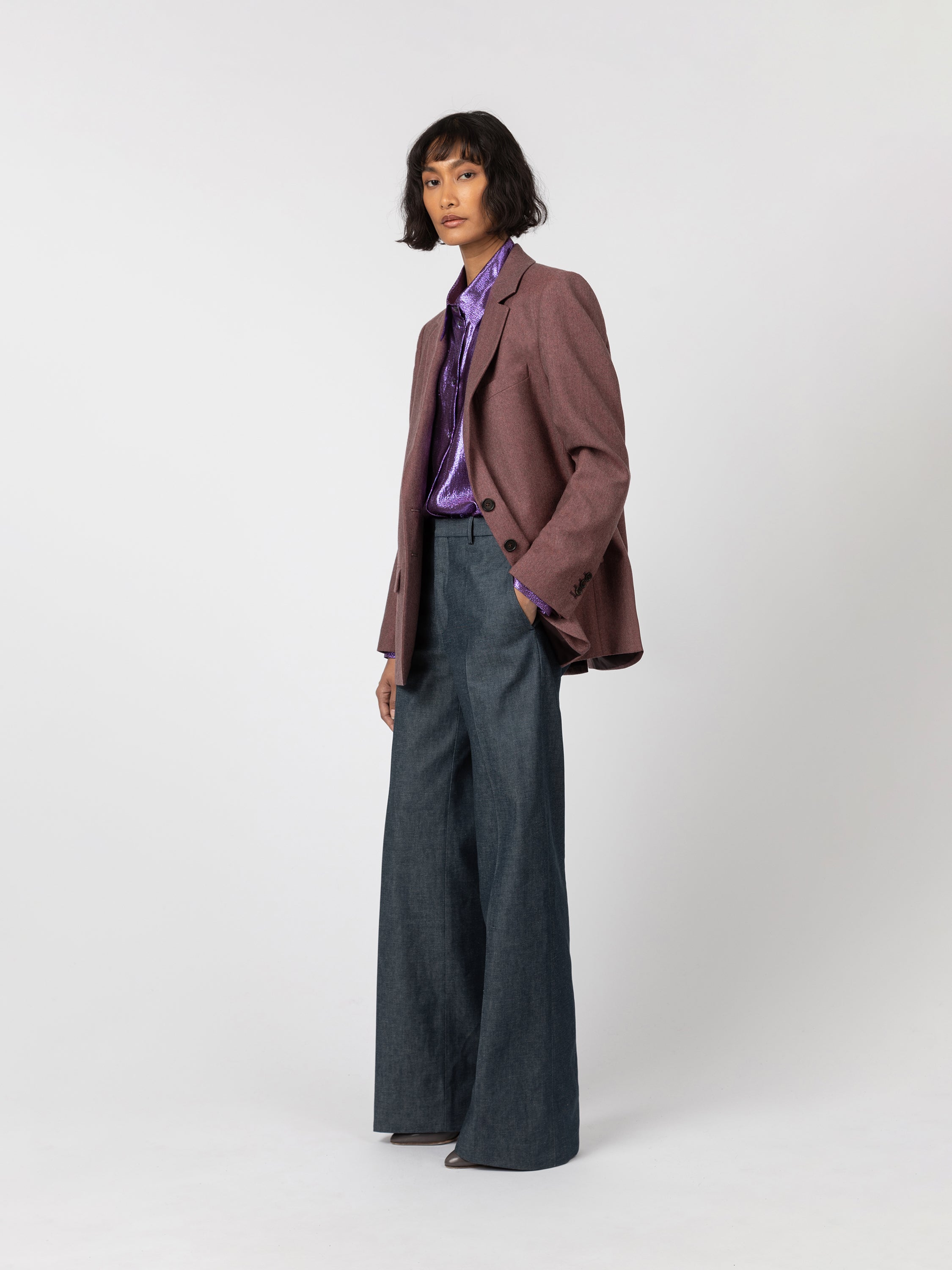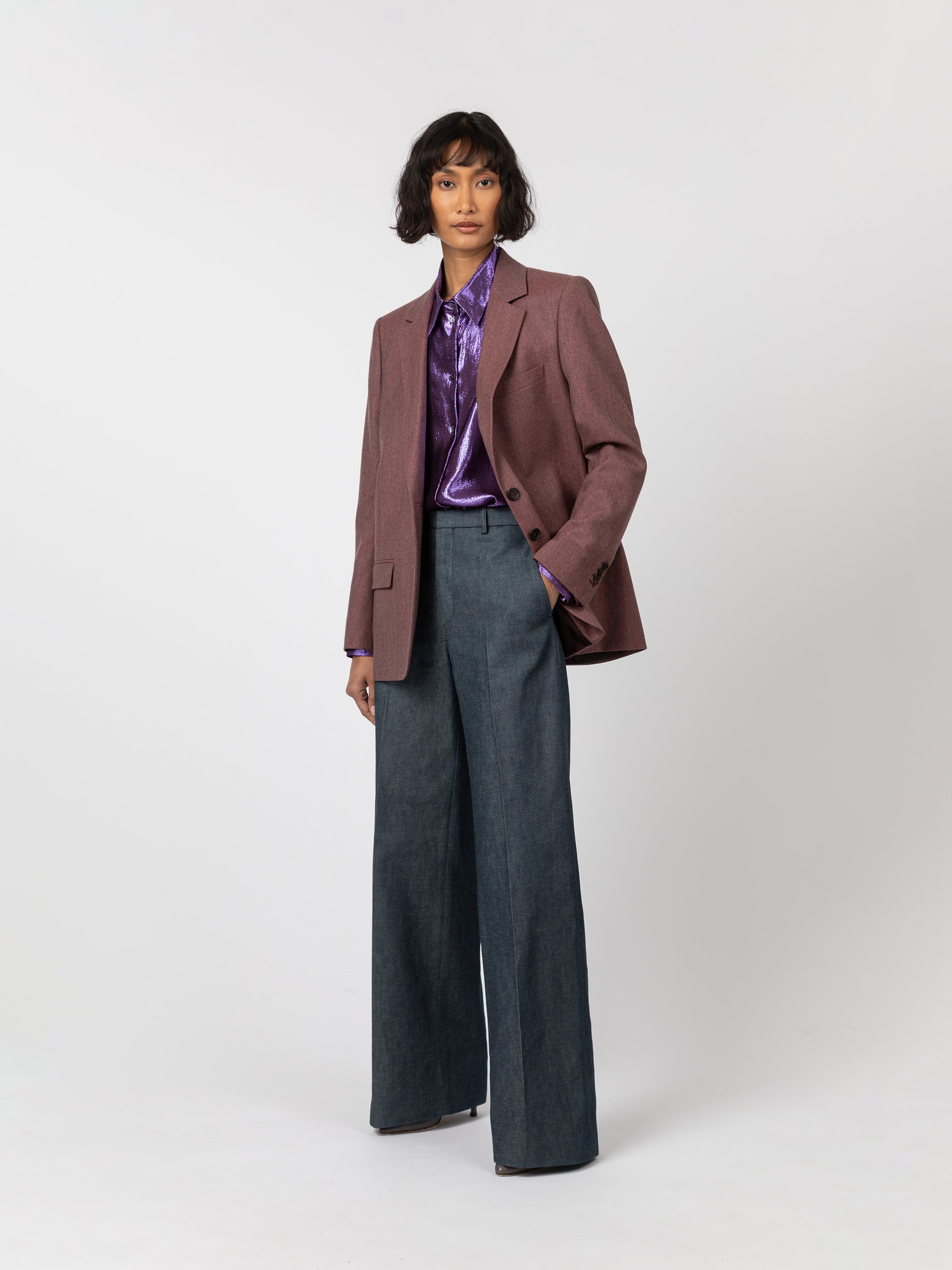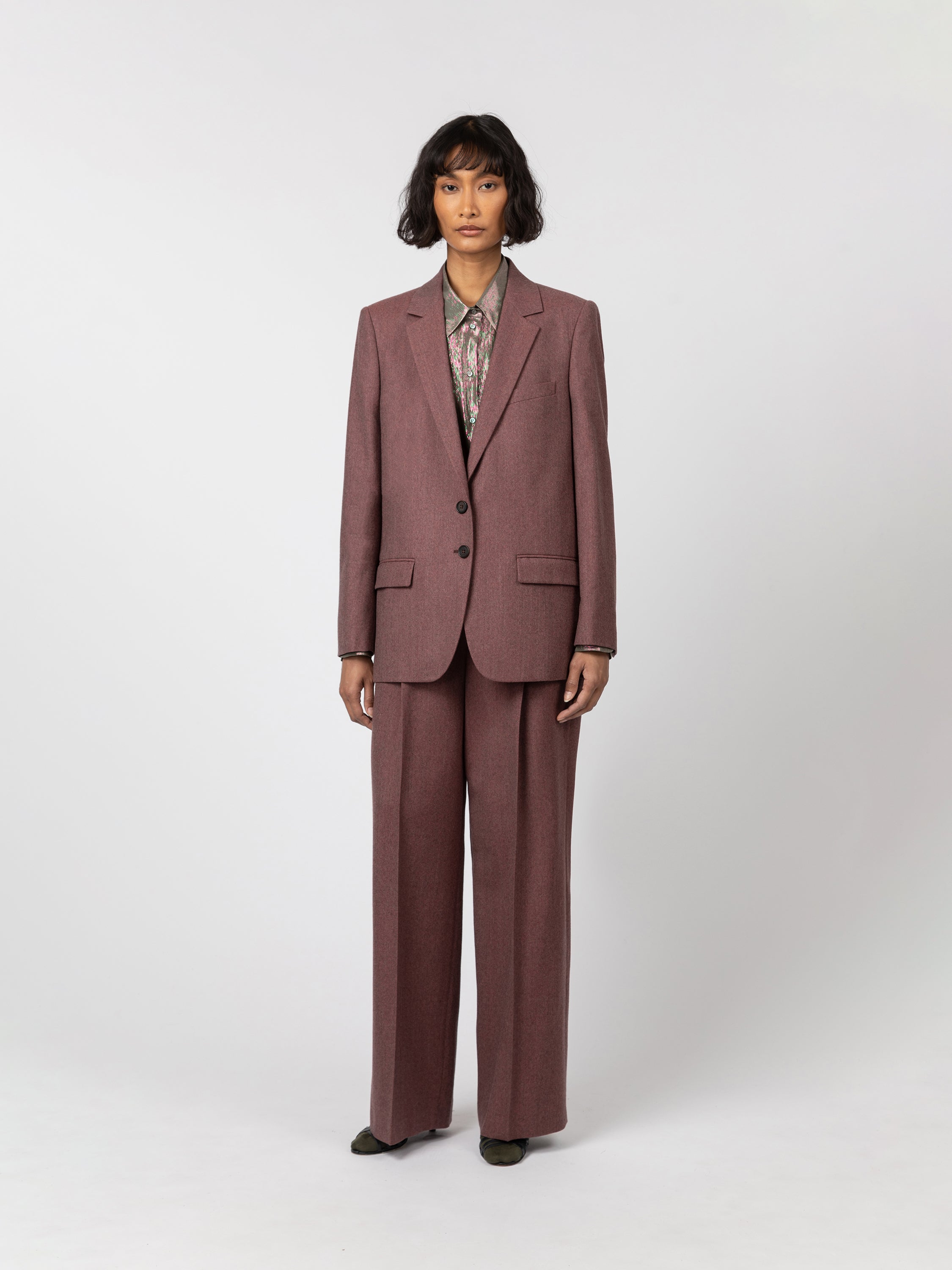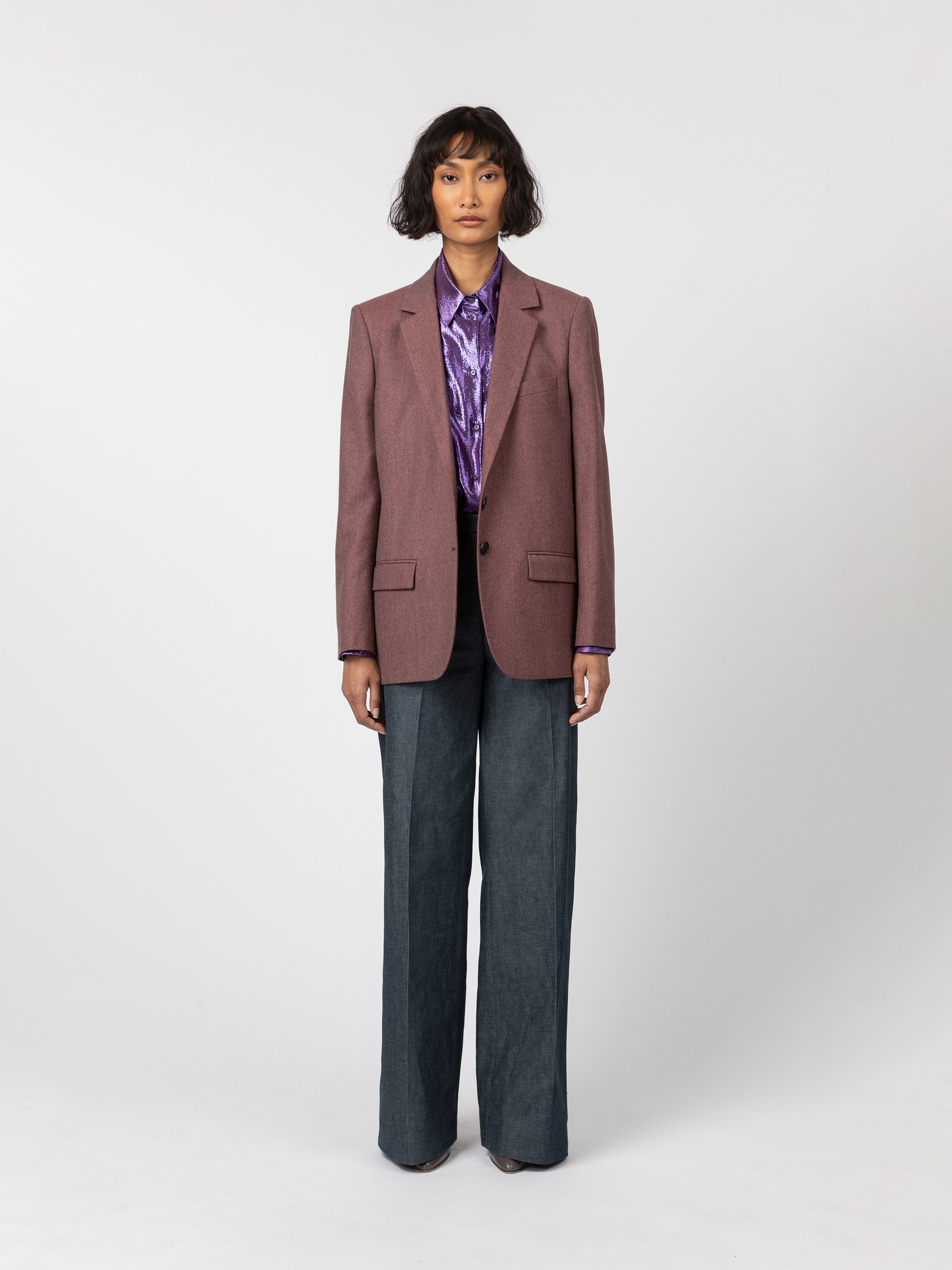 Cette veste est réalisée dans une lambswool souple et douce tissé dans le comté du Yorkshire en Angleterre. Elle présente une coupe droite et allongée. Elle emprunte des détails au vestiaire masculin comme le col à revers, les poches à rabat passepoilées, sa poche intérieure et sa poche poitrine à gauche. Elle se ferme devant et aux manches à l’aide de boutons en corne véritable. La veste est entièrement doublée.