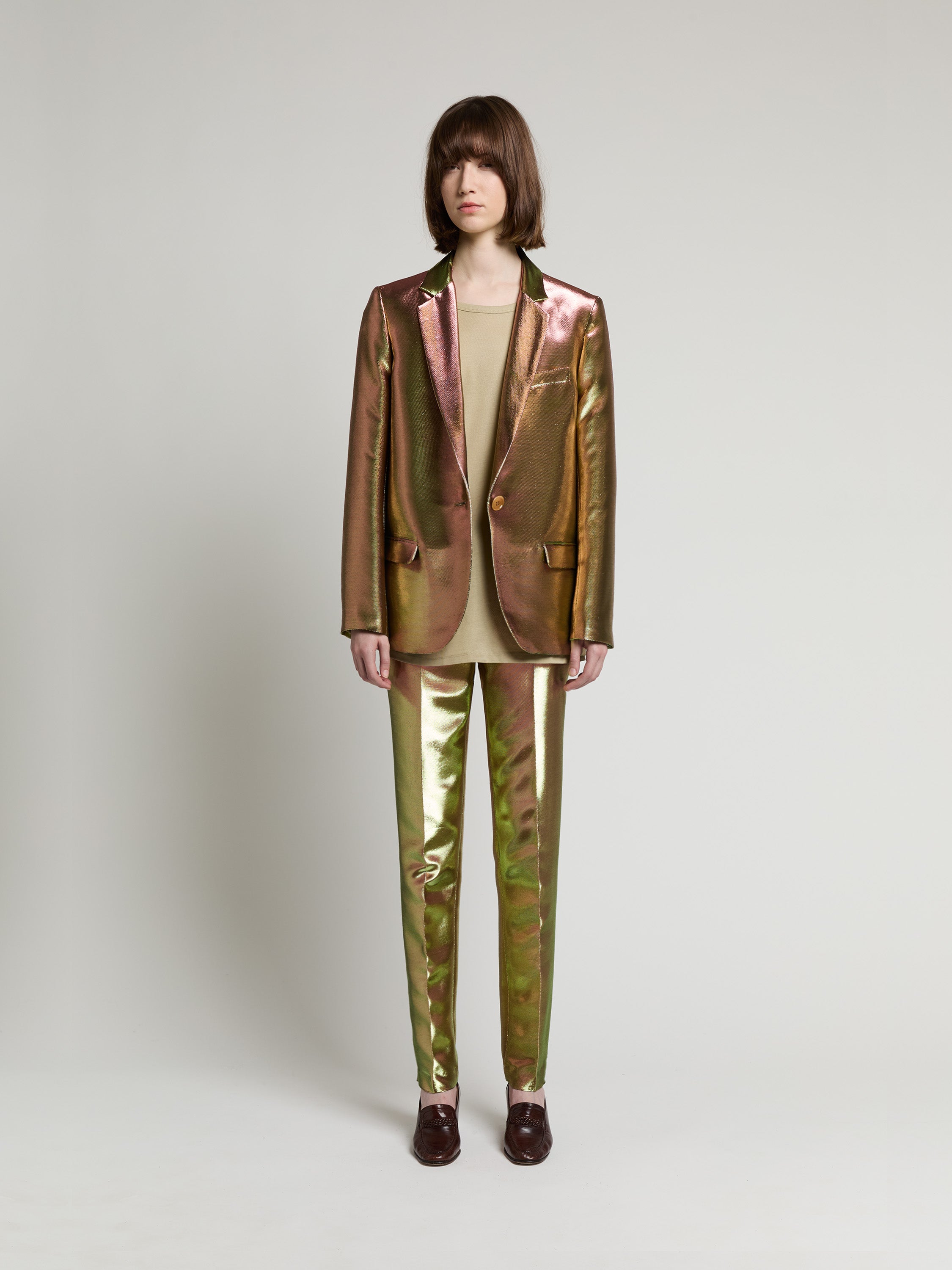 Le blazer est porté avec un T-shirt Kumquat en beige et le pantalon Juliane en avocado peach.