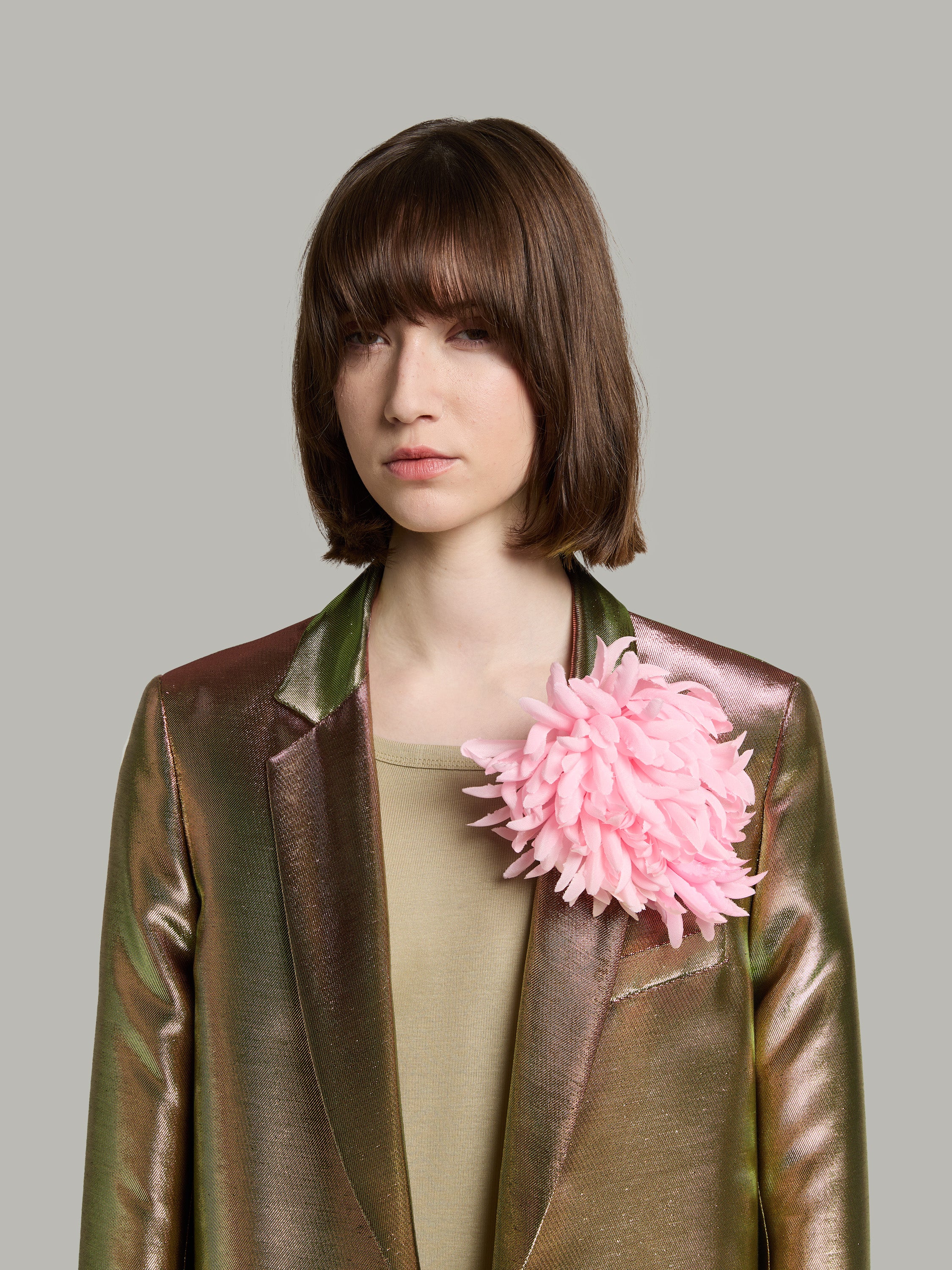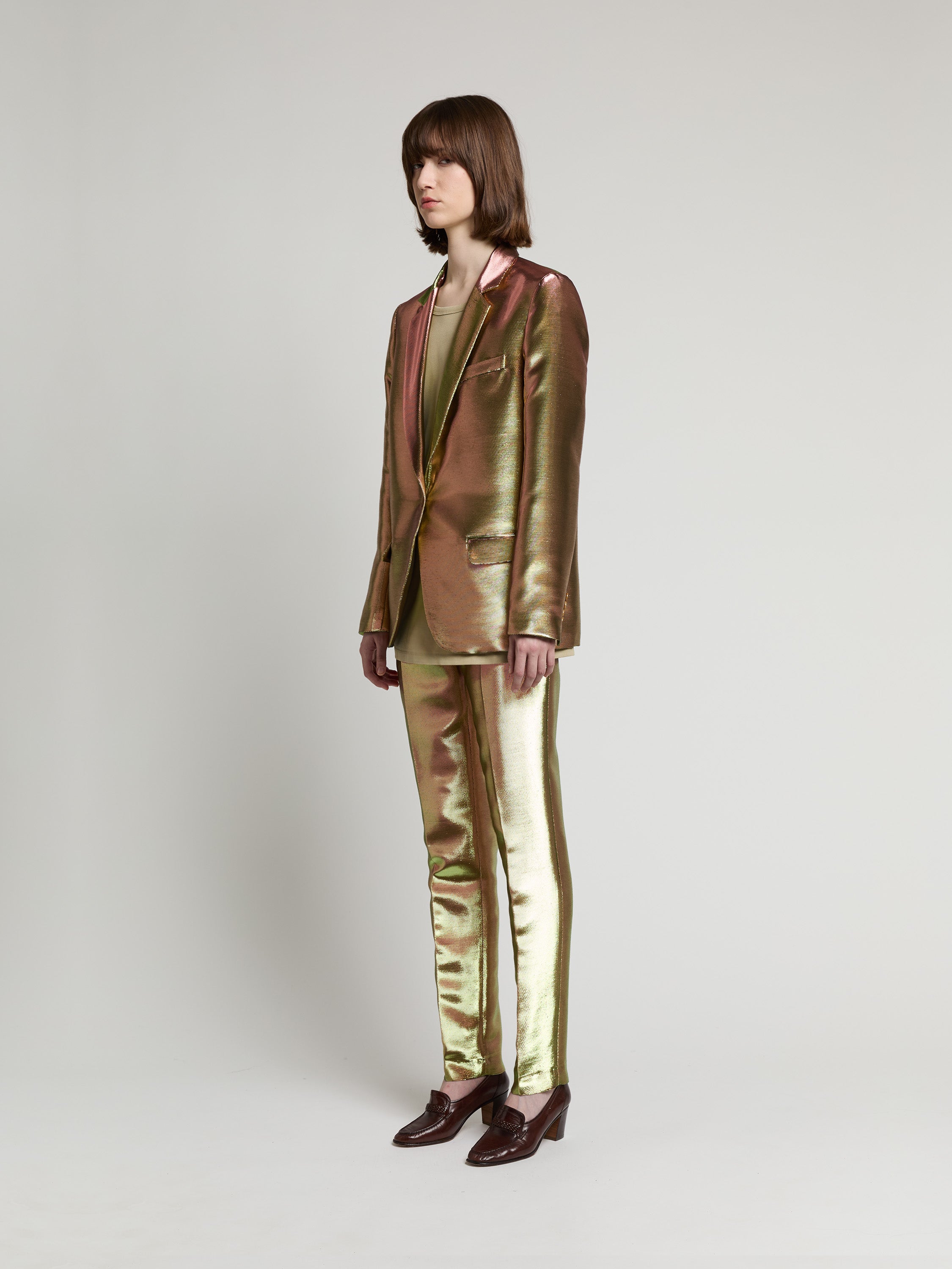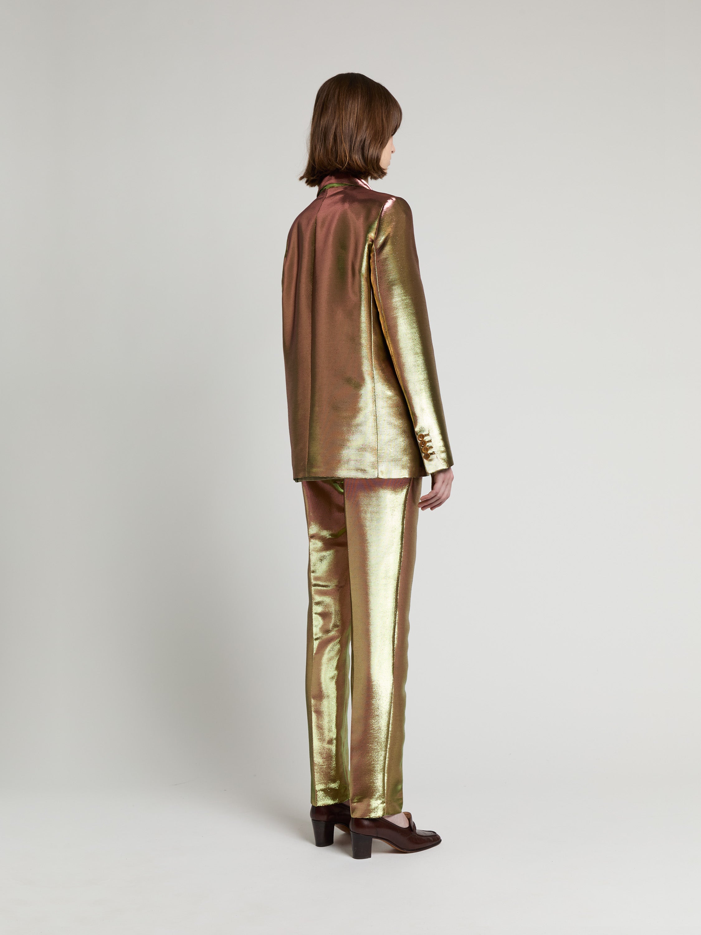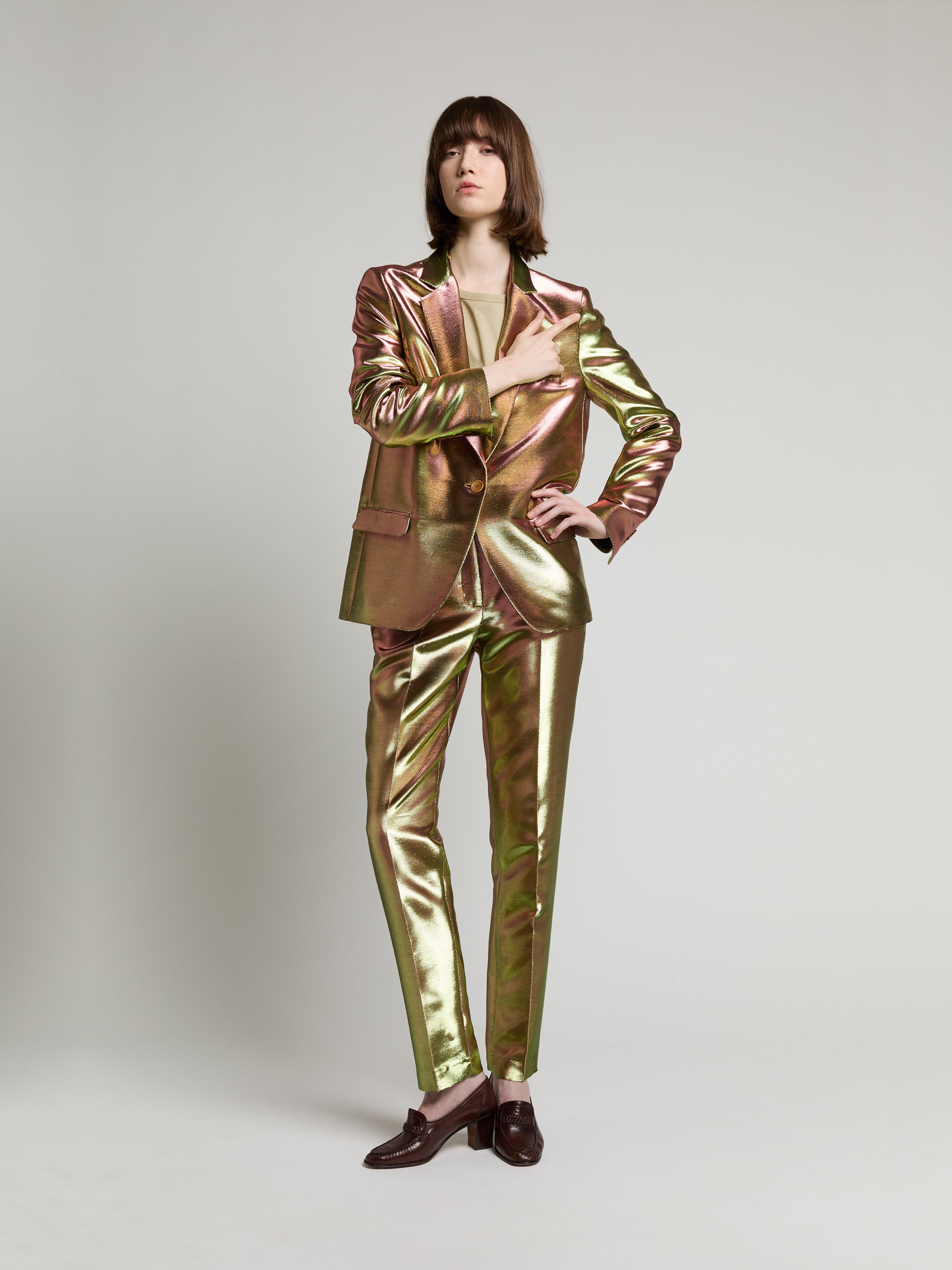 Pièce iconique du vestiaire INDRESS, cette veste droite et masculine est réalisée dans un twill de lurex tissé dans la région lyonnaise chez Denis & Fils. La veste se ferme à l’aide d’un unique bouton en corozo ton sur ton. Deux poches passepoilées à rabat et une poche poitrine structurent cette pièce. La veste est entièrement doublée. La dernière boutonnière en bas de manches n’est pas ouverte ce qui permet de raccourcir les manches si nécessaire.