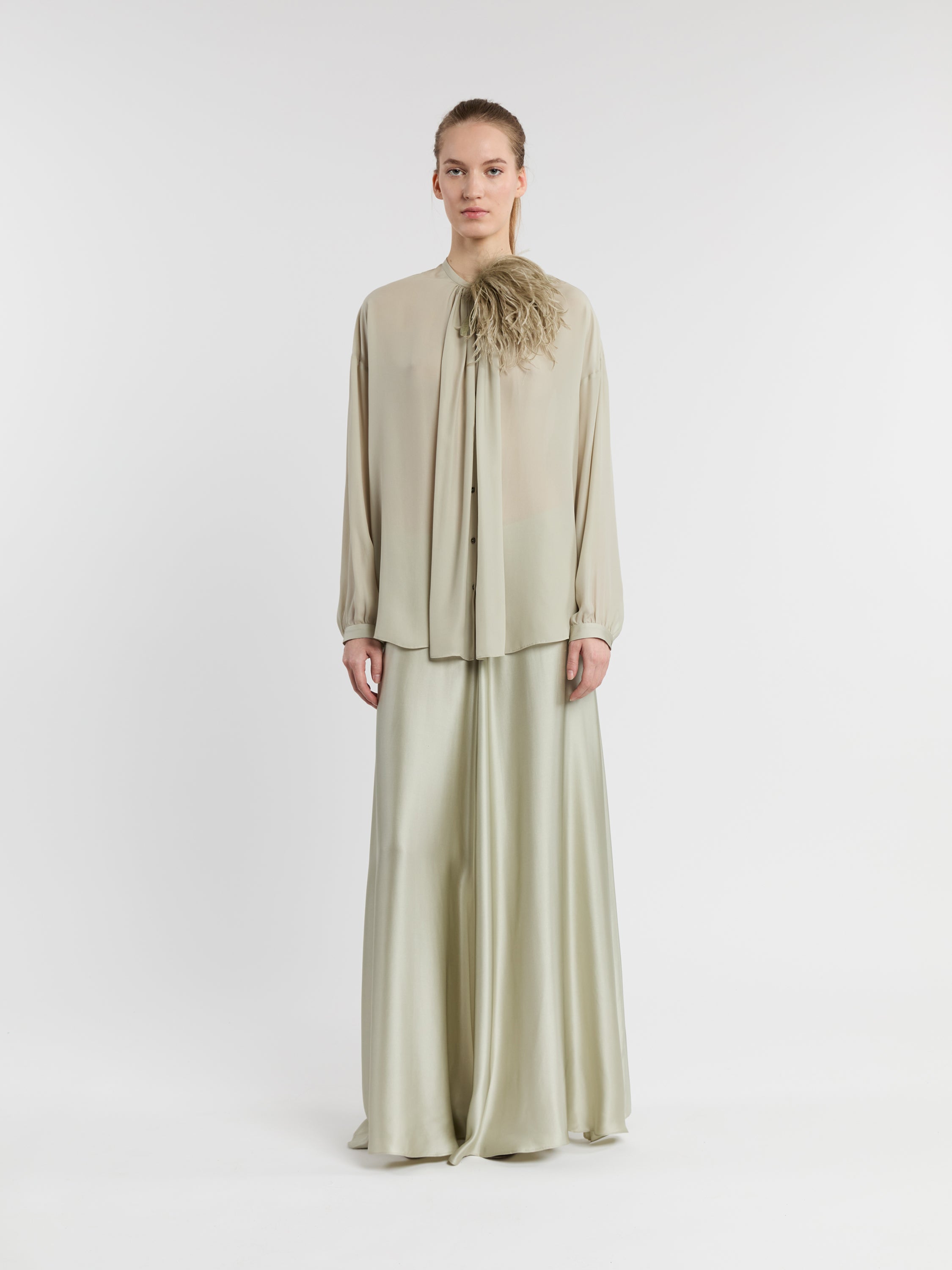 Confectionnée dans l’Oise par l’un des derniers ateliers plumassiers de France, cette broche en plumes d’autruche est teinte dans les couleurs de la collection, réalisées par le studio INDRESS. Au dos, elle est ornée de trois pétales de soie recyclée et d’une finition en cuir d’agneau. Le fermoir argenté de la broche vous permettra de la positionner sur la tenue de votre choix. Grâce à son élastique, vous pourrez également la porter dans vos cheveux ou à votre poignet.