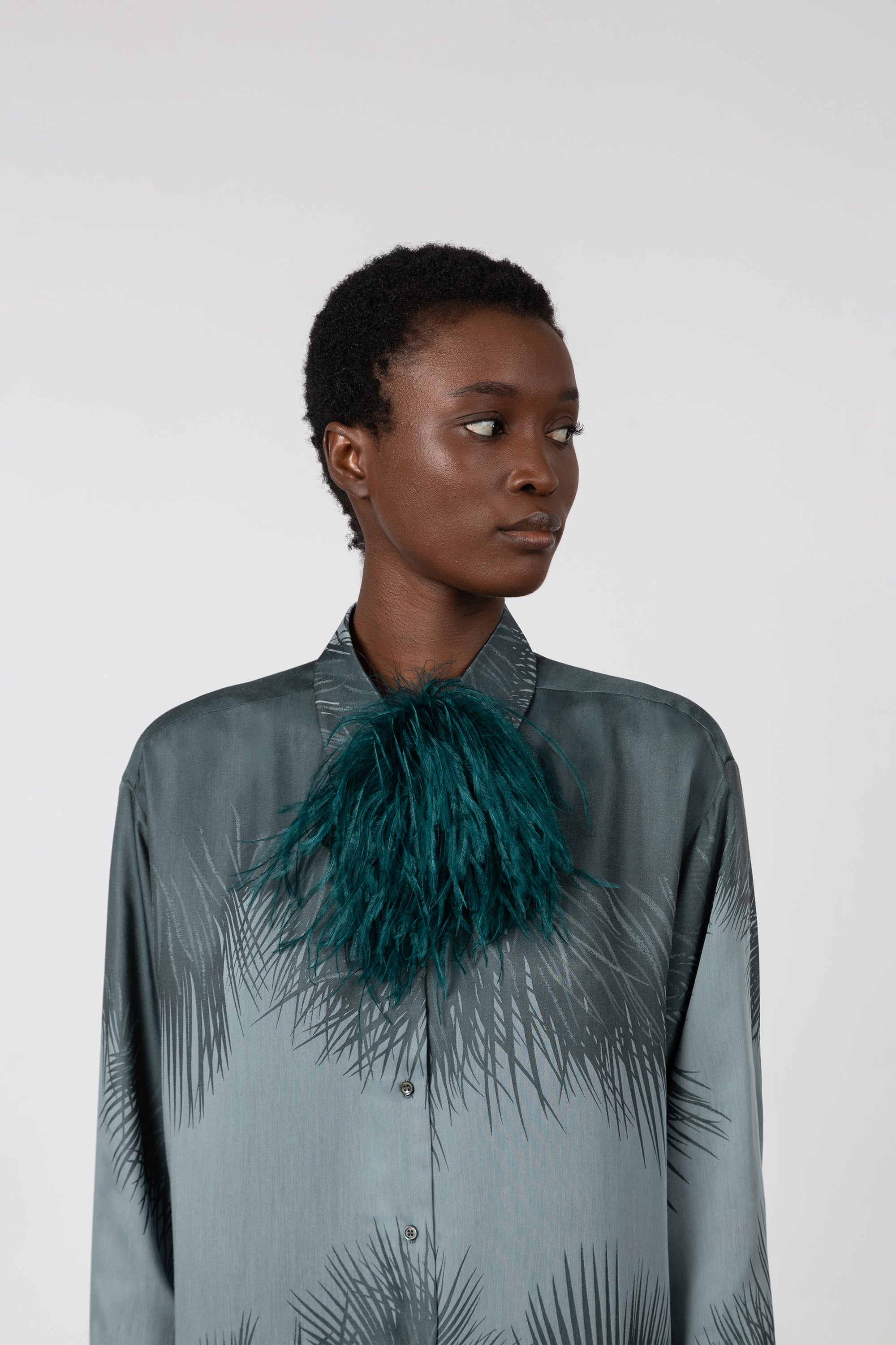 Confectionnée dans l’Oise par l’un des derniers ateliers plumassiers de France, cette broche en plumes d’autruche est teinte dans les couleurs de la collection, réalisées par le studio INDRESS. Au dos, elle est ornée de trois pétales de soie recyclée et d’une finition en cuir d’agneau. Le fermoir argenté de la broche vous permettra de la positionner sur la tenue de votre choix. Grâce à son élastique, vous pourrez également la porter dans vos cheveux ou à votre poignet.
