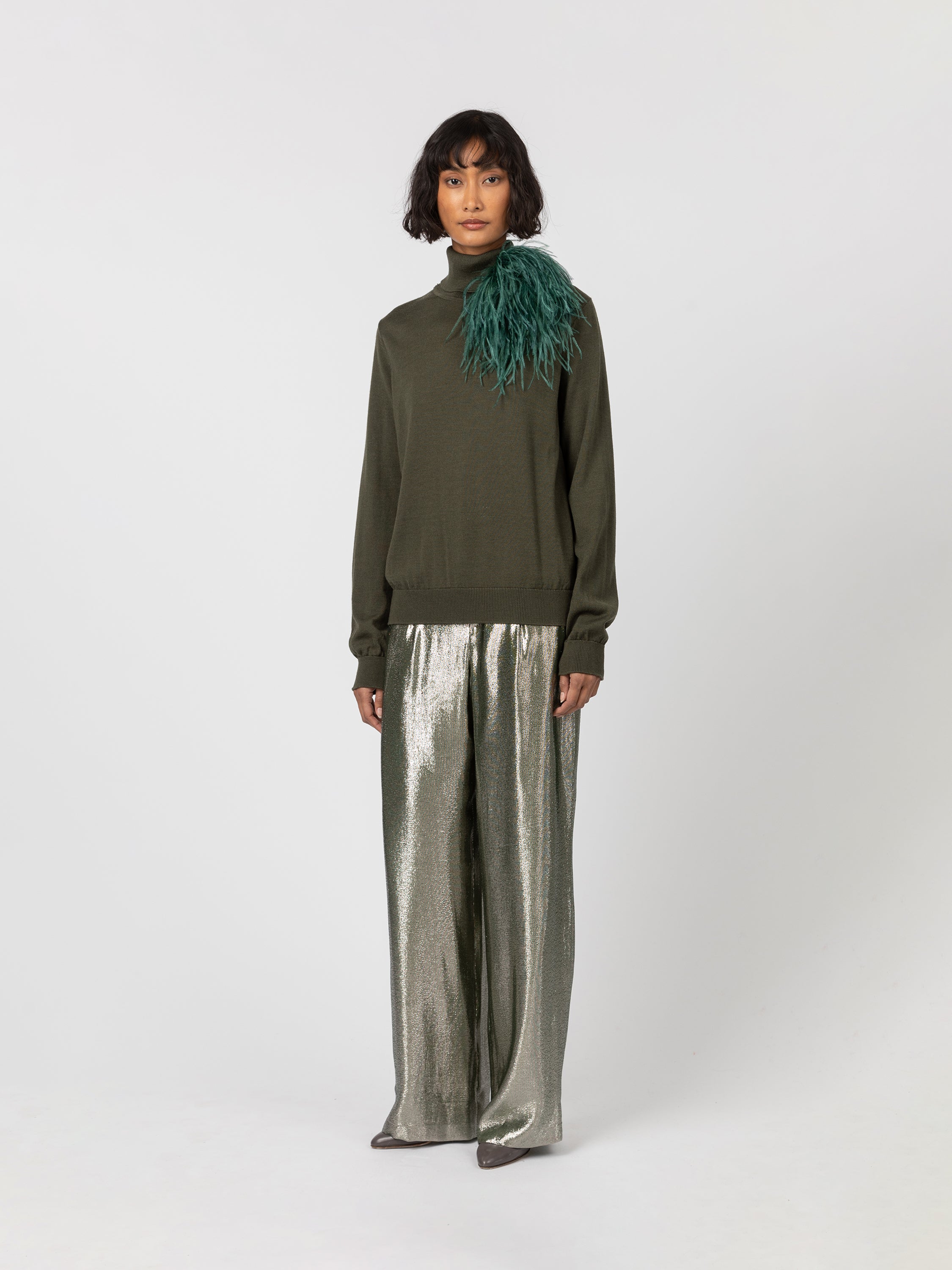 la broche est portée avec la chemise Brad en kaki et le pantalon Scarlett en green.