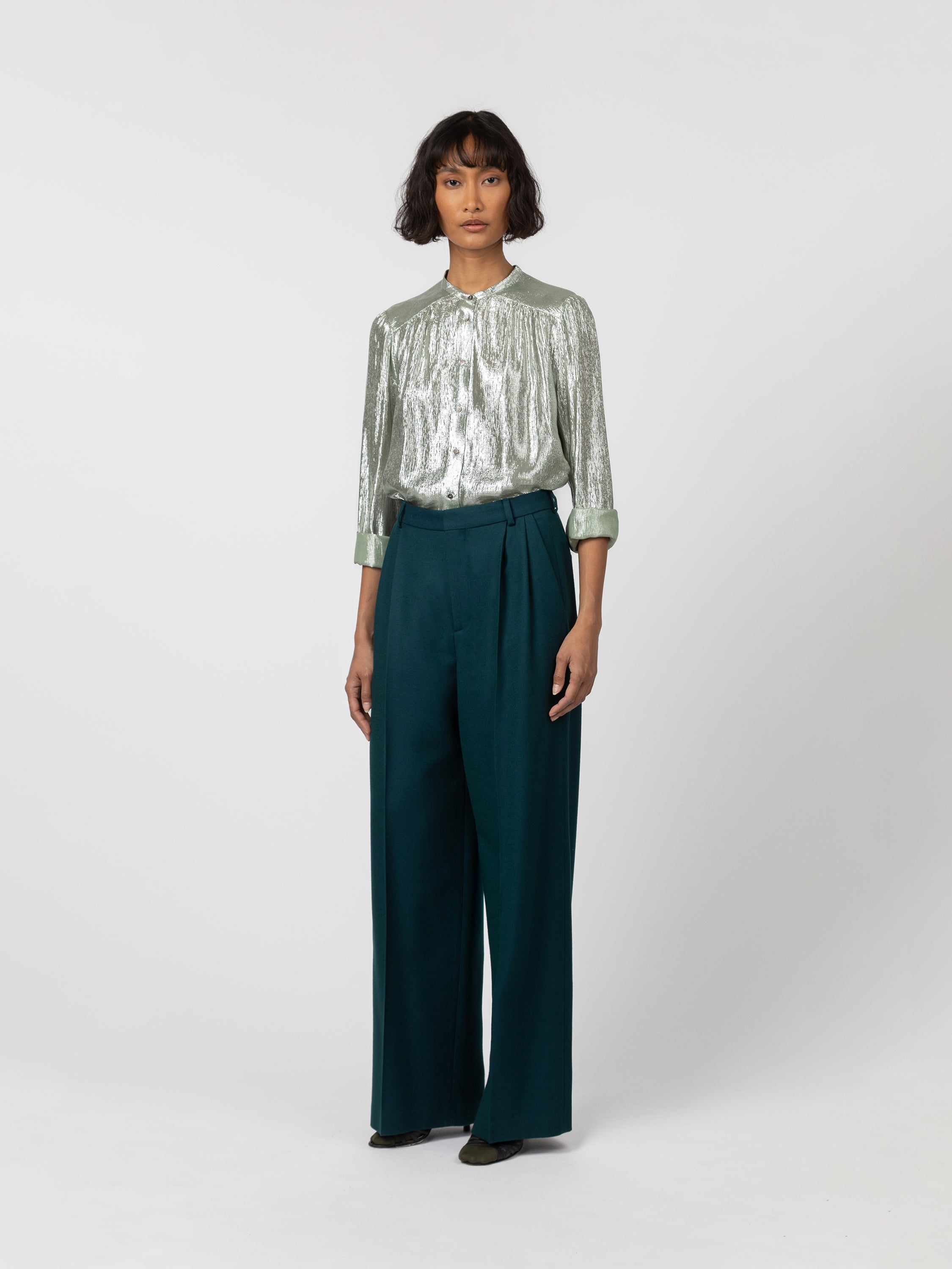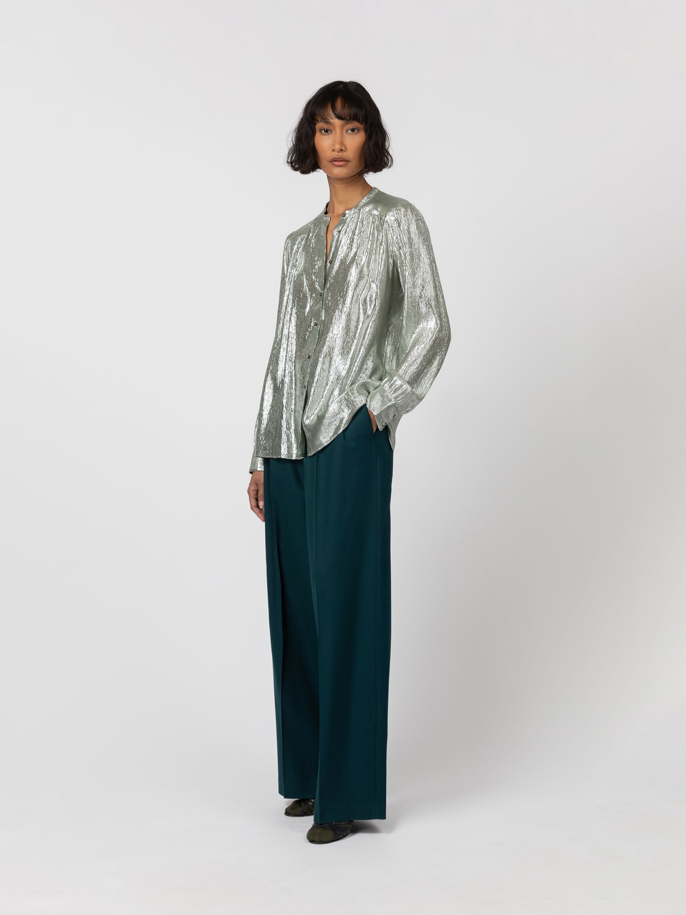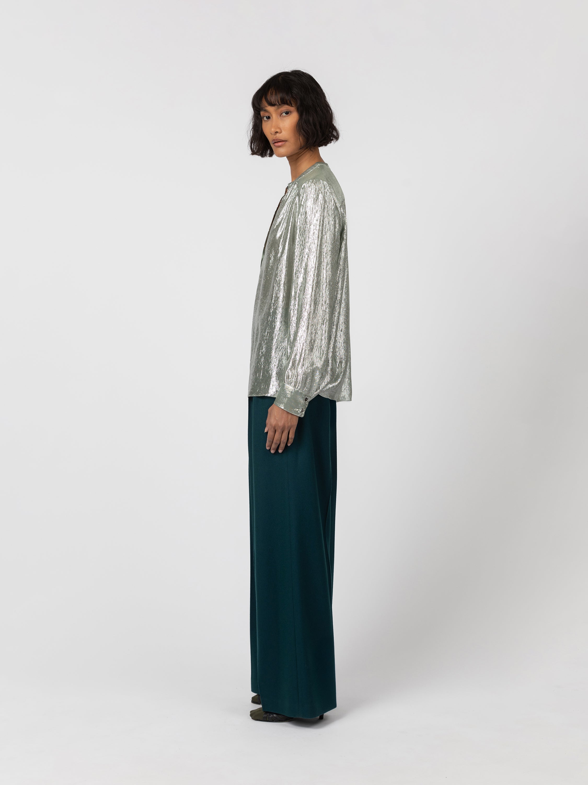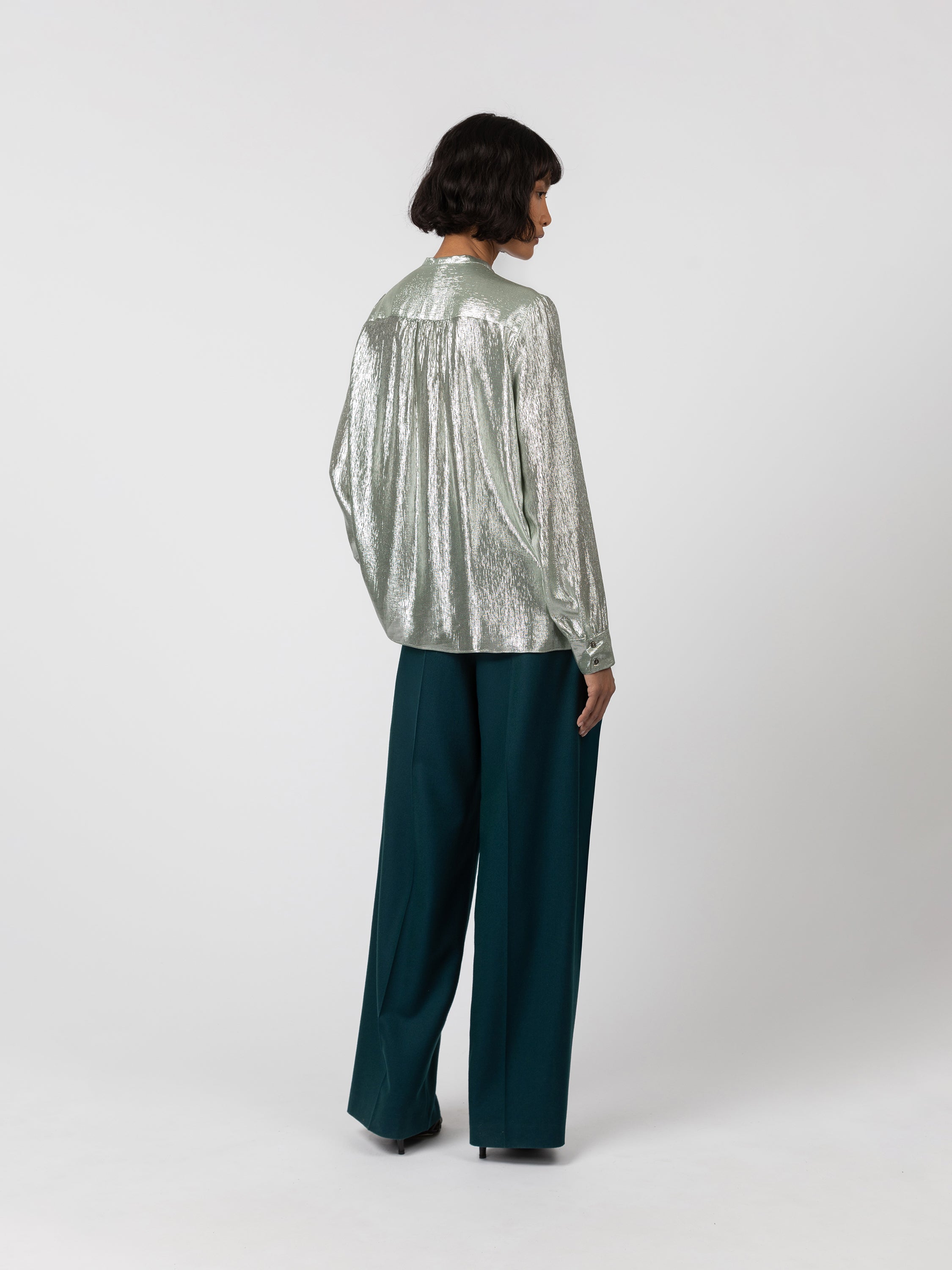 Cette blouse est réalisée dans un voile de soie et lurex tissé dans la région lyonnaise chez Denis & Fils. La soie est sur-teinte dans une couleur différente de celle du fil de lurex ce qui donne un aspect bicolore au tissu. La blouse est épurée et délicate. Elle présente une col Mao, une patte de boutonnage très fine et des épaules légèrement froncées. Au dos, elle est structurée par un empiècement avec un léger jeu de fronces.